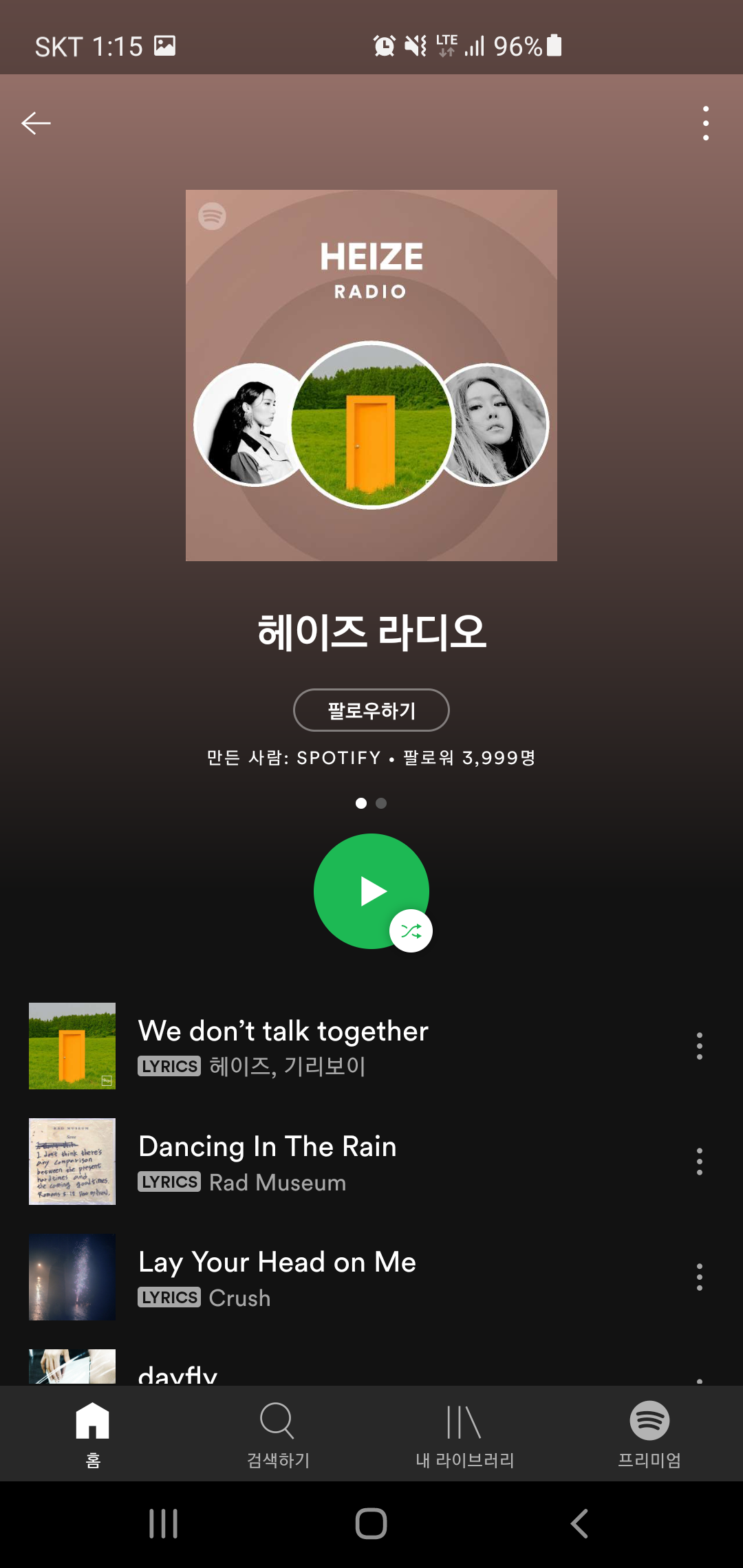특히 스포티파이를 처음 시작할 때 좋아하는 아티스트를 3명 이상 선택할 수 있는 항목이 있었는데요, 이는 곧 스포티파이를 시작함과 동시에 선택한 가수와 비슷한 성향의 노래들로 가득찬 플레이라디오로 구성되었습니다. 플레이리스트를 살펴보니 미처 몰랐던 노래부터 익히 알고 있는 노래까지 다양하게 구성되어 있더군요.