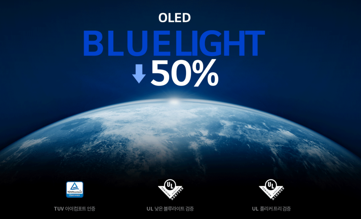 TV특성상 장시간 사용하는 경우가 많은데요, LCD TV보다 유해 블루라이트 방출량이 낮고, 플리커와 빛반사가 적어 보다 오래 보고 가까이 봐도 안심할 수 잇습니다. 무엇보다 국내 유일 TUV 아이컴포트 인증과 UL낮은 블루라이트 검증 그리고UL 플리커프리 인증도 받아 보다 눈이 편안합니다.