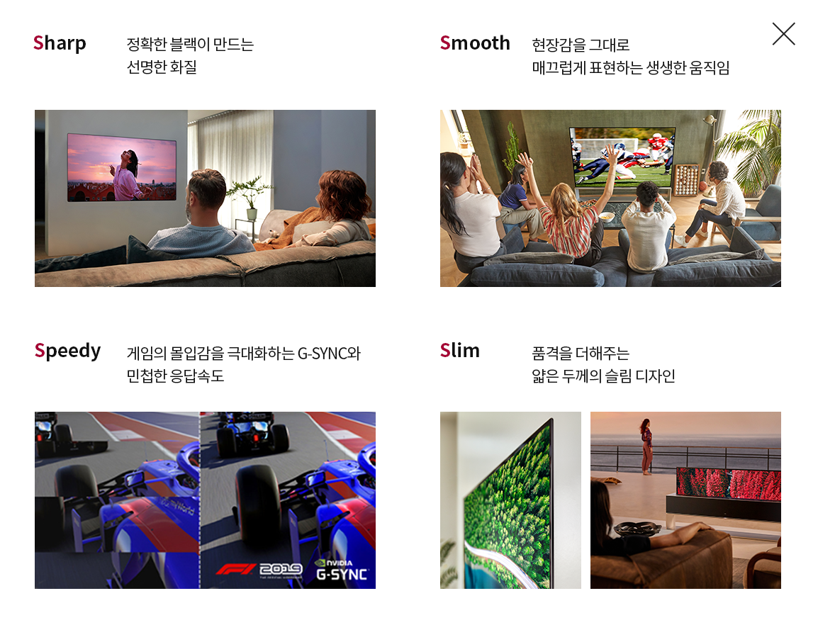 LG 올레드 TV의 핵심 가치는 4S와 눈이 편한 점에 있습니다. 4S라고 하면 , 백라이트가 없어 더욱 선명한 화질, 올레드 프로모션 기능으로 스포츠 경기의 역동적인 움직임을 매끄럽고 생생하게 표현하는 매끄러운 화면전환, 그리고 1ms의 빠른 응답속도로 G-SYNC 호환지원과 HDMI 2.1탑재등 고사양 게임도 끊기지 않고 몰입감 넘치는 게임을 즐길 수 있습니다. 또한 대화면임에도 부담스럽지 않은 극도로 슬림한 디자인으로 공간을 더욱 아름답게 연출할 수 있는 점입니다.