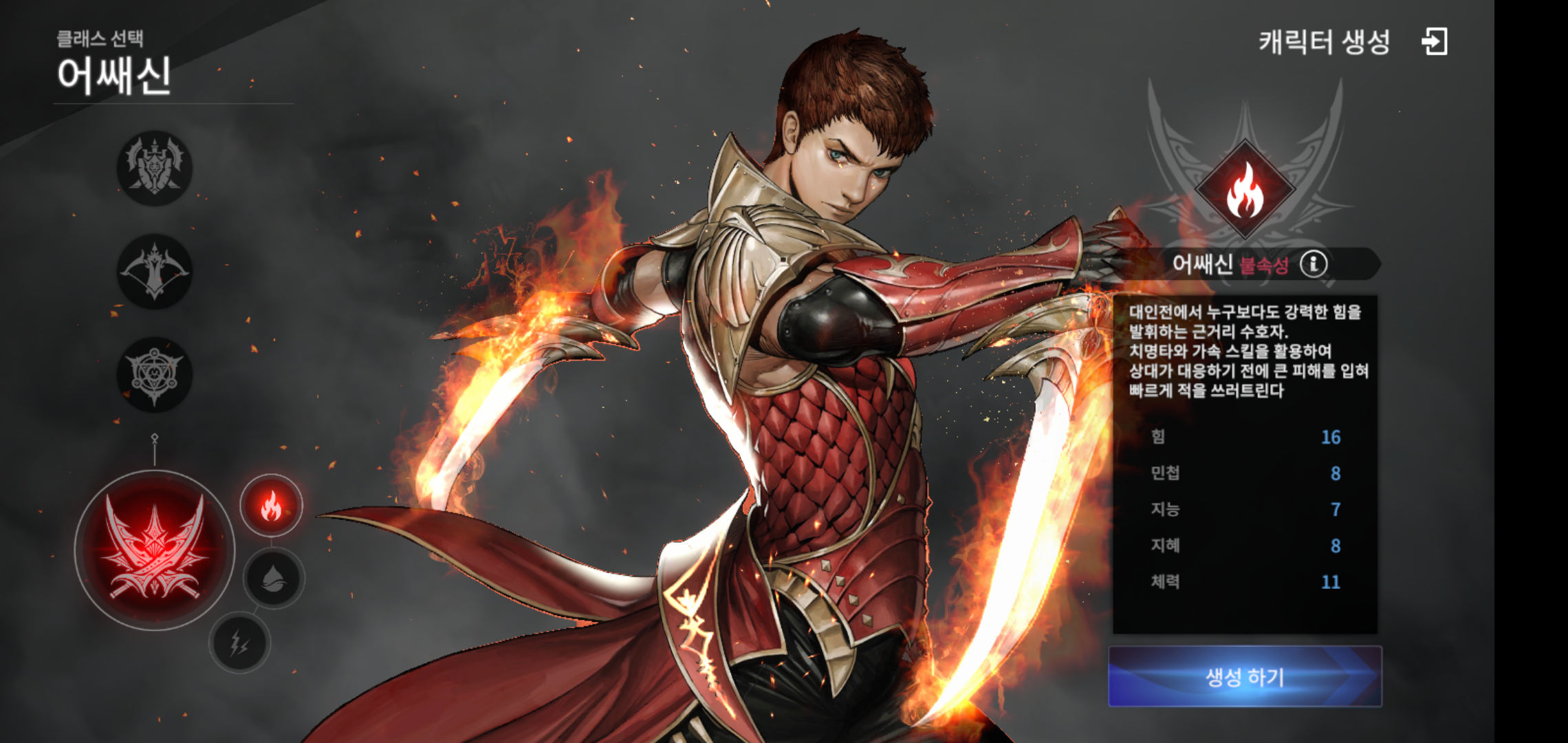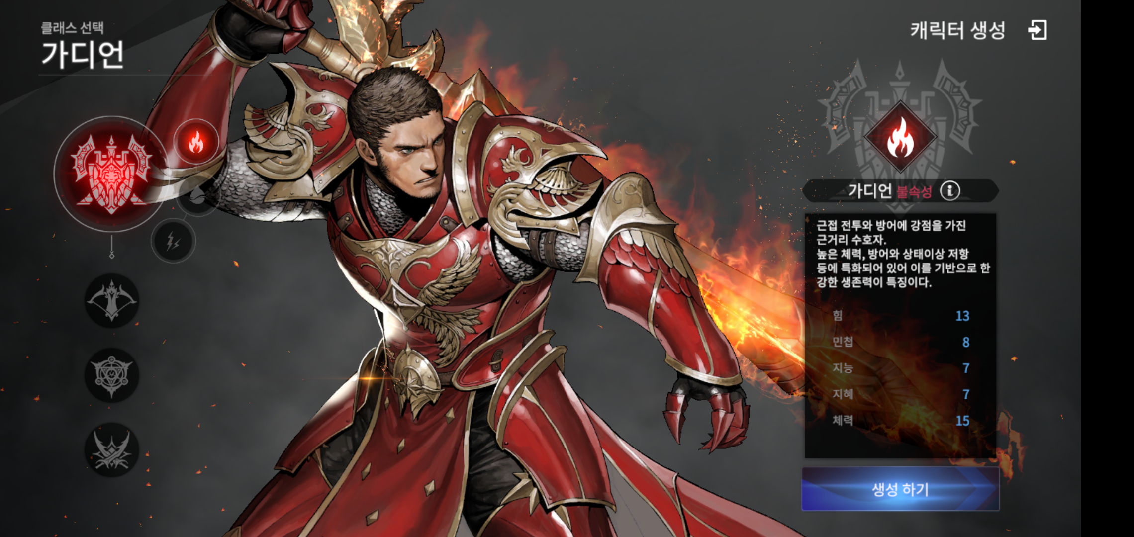 이카루스 이터널의 경우 캐릭터 선택부터 색다른 점들이 눈에 띄었습니다. 가디언, 어쌔씬, 위자드 그리고 레인저 4가지 클래스와 그에 따른 불, 물, 전기 속성중 하나를 선택해 진행 가능하도록 구성되어 있어 선택의 폭이 넓은 점이 마음에 들었습니다.