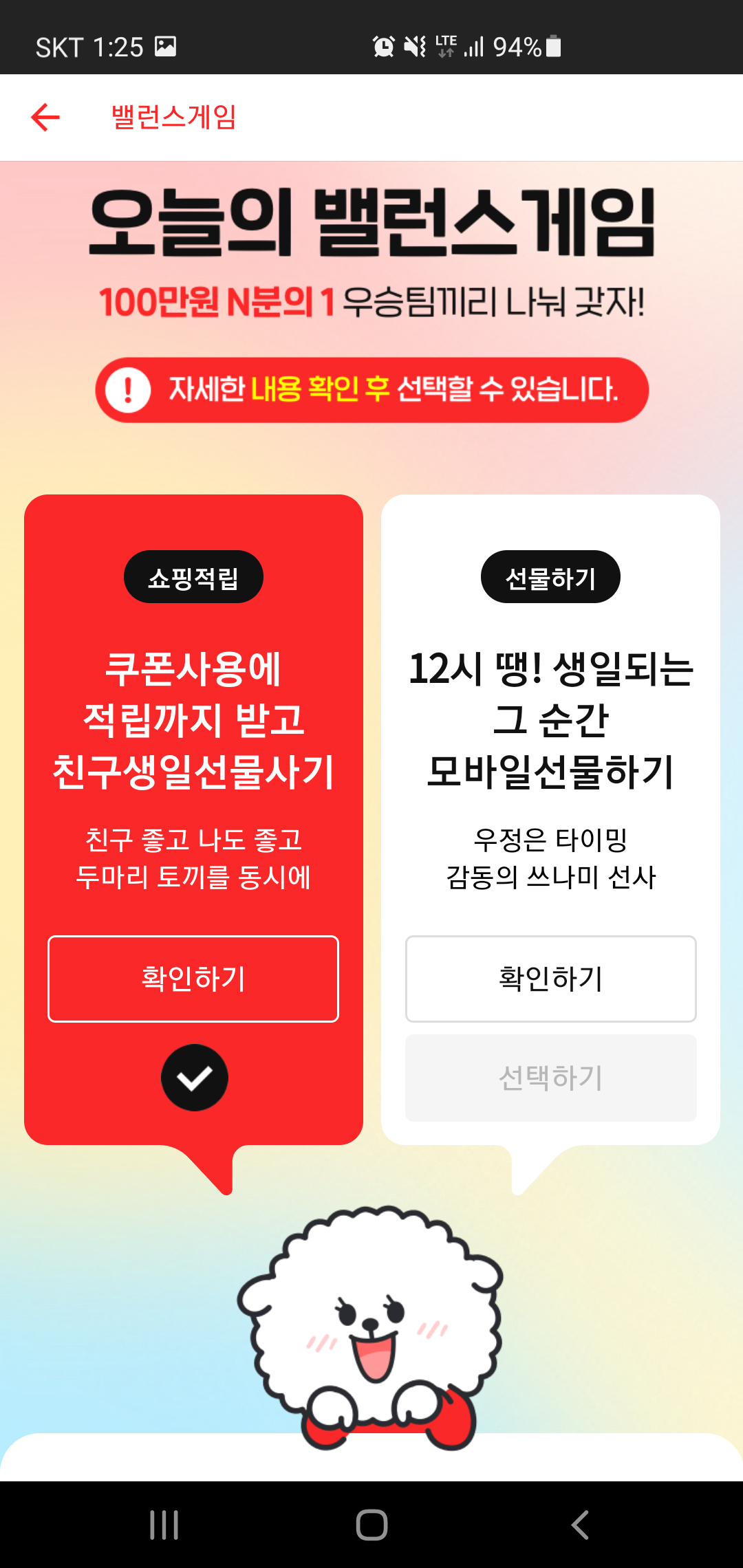 밸런스 게임에 등장하는 두가지 선택의 내용을 확인한 후 최종 하나를 선택하게 됩니다. 이때 고민이 되는 점이 바로 주어지는 혜택인데요, 우승팀에게만 혜택금액의 n/1을 해 지급하기 때문입니다. 즉.. 내가 원하는 답을 선택하기 보다 많은 사람들이 선택하는 답을 찾아야 주어지는 혜택을 받을 수 있으니 말이죠.