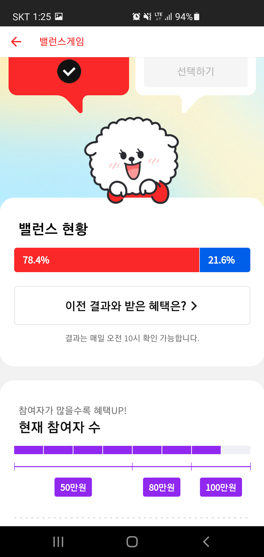 밸런스 게임의 경우 참여자가 많을 수록 나눠가지는 혜택도 많아져 최대 100만원의 비용을 우승팀에서 N/1 로 나눠가질 수 있습니다. 막성 선택 전까지는 현황을 알수 없기 때문에 선택 버튼을 누르는 순간까지 긴장감이 상당한데요, 밸런스 현황을 보는 순간 선택한 항목이 우세하면 그렇게 기분 좋을수가 없습니다.