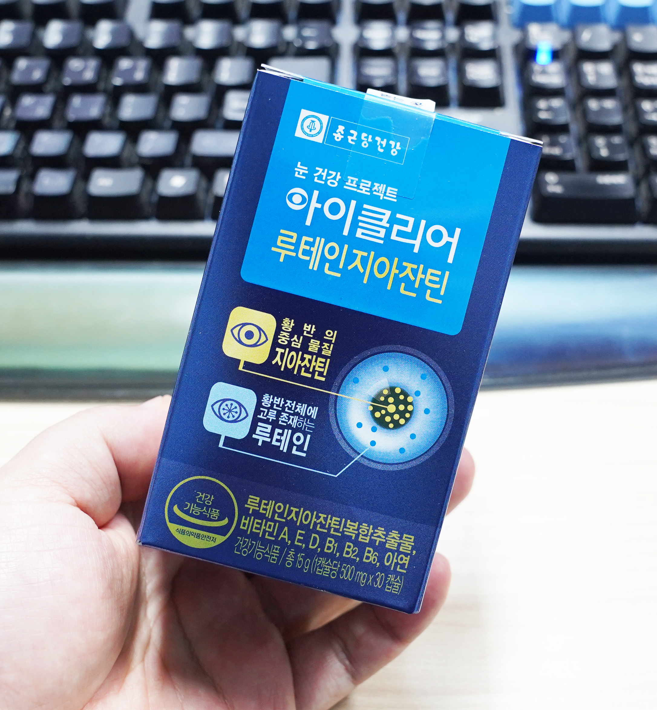 종근당 아이클리어 루이인지아잔틴의 경우 루테인지아잔틴 성분을 포함해 8가지 복합 성분으로 구성되어 있는점도 특징입니다. 어두운 곳에서 시작 적응을 위해 필요한 비타민A와 뼈 형성과 유지 및 칼슘과 인이 흡수되는데 필요한 비타민 D, 유해 산소로부터 세포를 보호하는 비타민E, 이외에 아연과 비타민  B1,B2,B6까지 모두 포함되어 있고, 부원료로 빌베리 추출물과 결명자 추출물 분말, 블루베리 농축분말까지 들어가 눈 건강에 좋은건 다 들어 가 있는 것 같습니다.