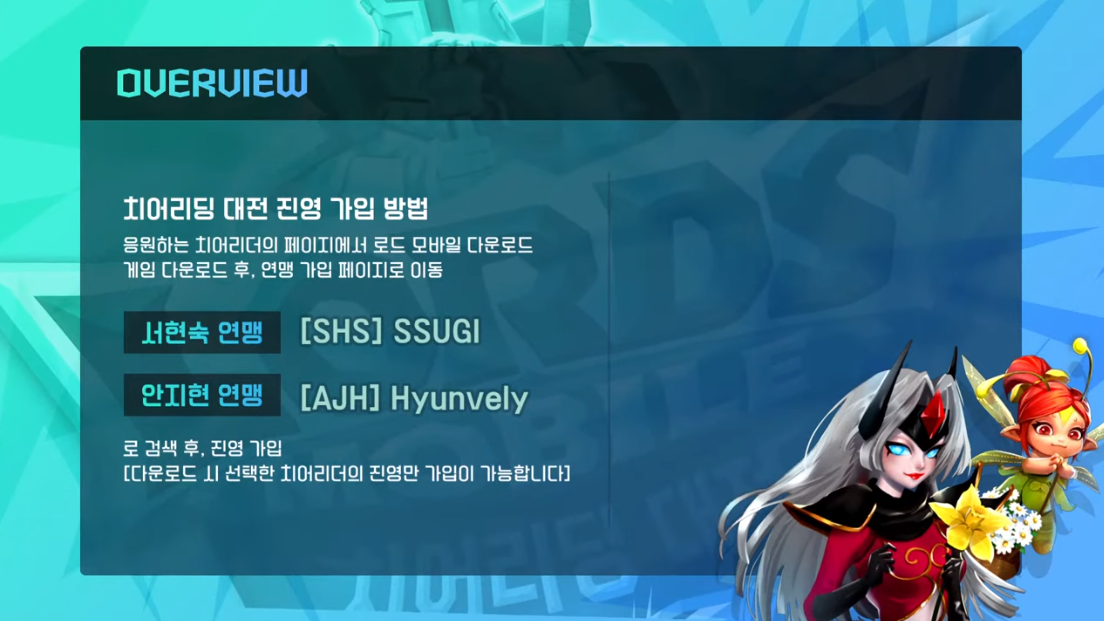 로드모바일 치어리딩 대전의 묘미는 참가자 모집후 진행되는 서현숙 진영과 안지현 진영 모두에게 주어집니다. 승리한 진영의 경우 치어리더에게 상금 500만원을 지급하고 능력 TOP 50명에게는 화보집이 주어지고, 전원 3~20만원 상당의 아이템이 지급됩니다. 패배한 진영의 경우에도 보상이 주어지는데요, 승리 연맹과 전투 격차 10% 이하일 경우 전원 브로마이드가 주어지고, 연맹 모집 대전쟁에서 이겼지만 군주전에서 패배했을 경우에 주어지는 보상도 있어 도전해 볼만 합니다.