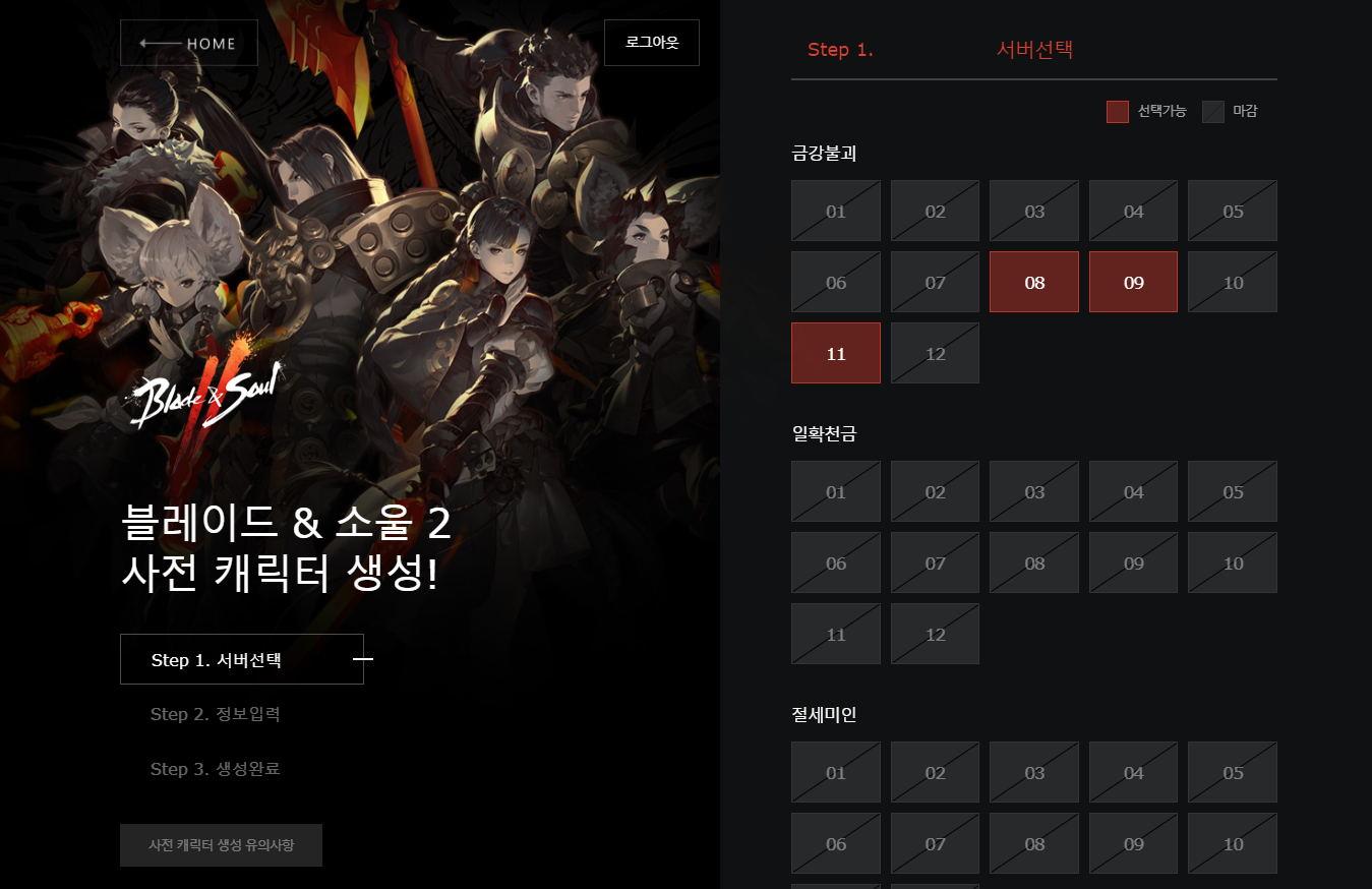 사전캐릭터 생성에 참여하니 마감된 서버가 얼마나 많은지 놀랍더군요. 더 늦기전에 참여한 것을 위로 삼아 서둘러 캐릭터 생성이 가능한 서버를 선택한 후 캐릭터 생성을 진행하였습니다.