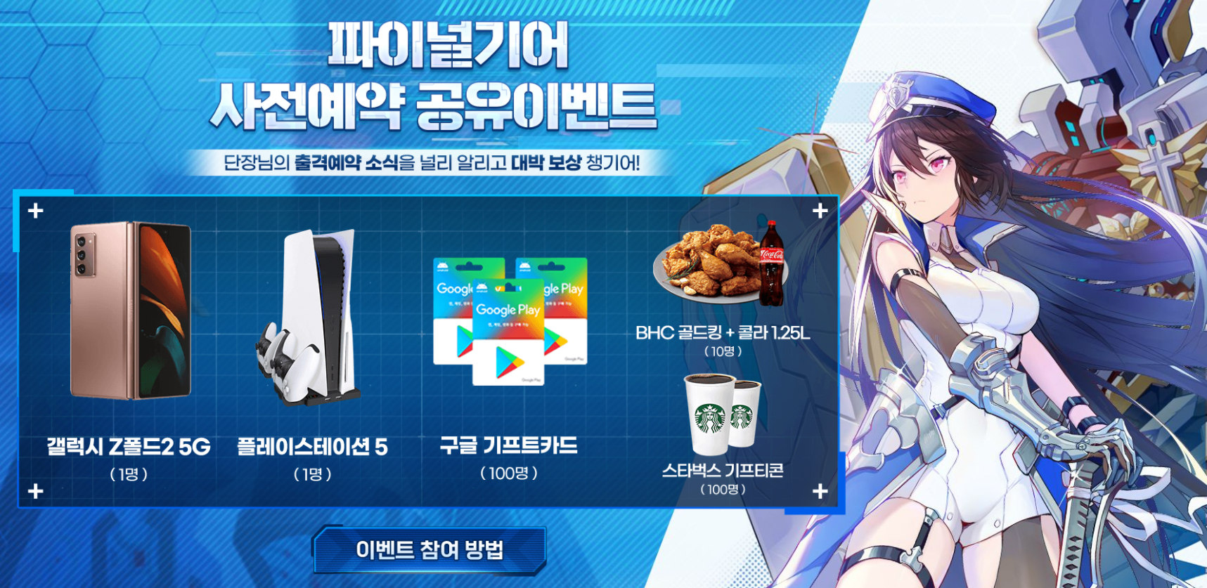 파이널기어 사전예약 공유 이벤트도 진행 중입니다. 페이스북과 트위터 둘 중 하나의 SNS에 자동으로 작성되는 파이널 기어 홍보 이벤트 글과 해시태그를 확인한 후 공유한 뒤 공유한 글을 링크와 함께 공식카페에 인증하면 참여가 완료됩니다. 참여한 분들 중 추첨을 통해 갤럭시 Z폴드2 5G 를 비롯해 플레이스테이션5, 구글기프트카드등 다양한 선물이 준비되어 있어 가벼운 마음으로 이벤트에도 참여하고, 선물도 받아보시면 좋을 것 같습니다.
