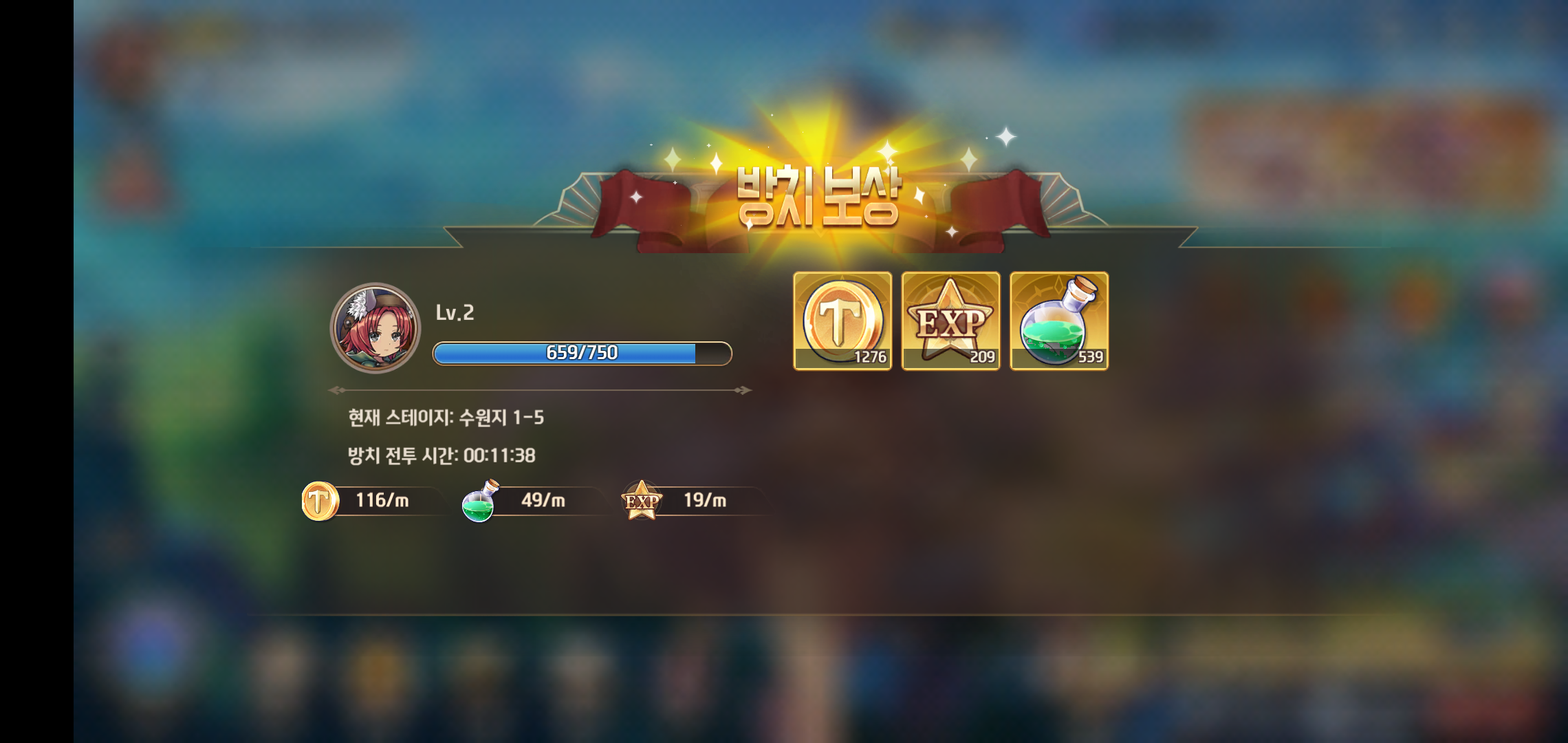 소녀X헌터는 전투를 진행하지 않아도 클리어한 스테이지에 따라 방치형 전투가 진행됩니다. 그에 따른 경험치와 함께 추가 보상도 주어져 알아서 성장하고, 접속해 플레이를 해야 한다는 부담감도 크지 않아 보아 여유로운 플레이를 즐길 수 있습니다.