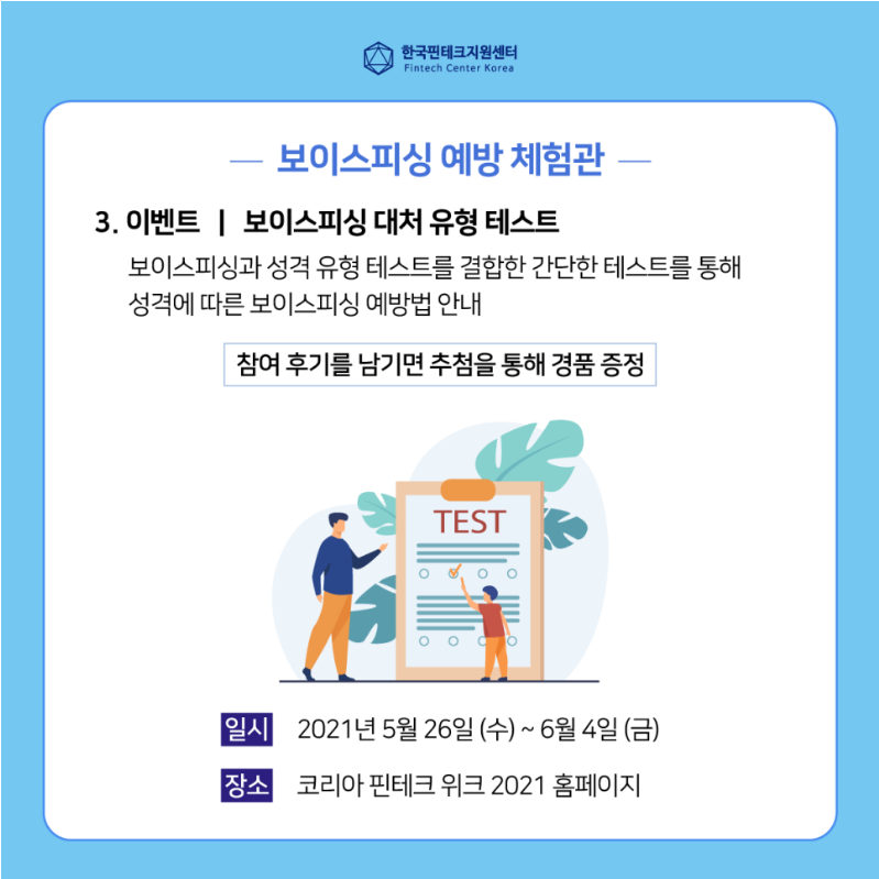 핀테크와 지속 가능한 금융 혁신이란 주제로 진행되는 코리아 핀테크 위크 2021. 오프라인 행사장에서만 진행 되는 것이 아니라 온라인과 함께 진행되는 만큼, 관심 있는 분들이라면 홈페이지를 통해서도 관련 모든 정보를 확인할 수 있어 관심 있는 분들이라면 핀테크 관련 정보와 함께 채용 및 보이스피싱에 대한 정보들도 확인해 보시기 바랍니다.