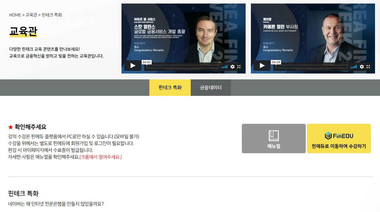 핀테크에 관심 있는 분들이라면 11월 30일까지 운영되는 교육관을 활용해 보시는 것도 좋을 것 같습니다. 홈페이지에서 무제한 수강 가능하며, 수료 기준을 충족한 수강생에게는 구직 및 입시에 활용 가능한 수료증도 발급 합니다.