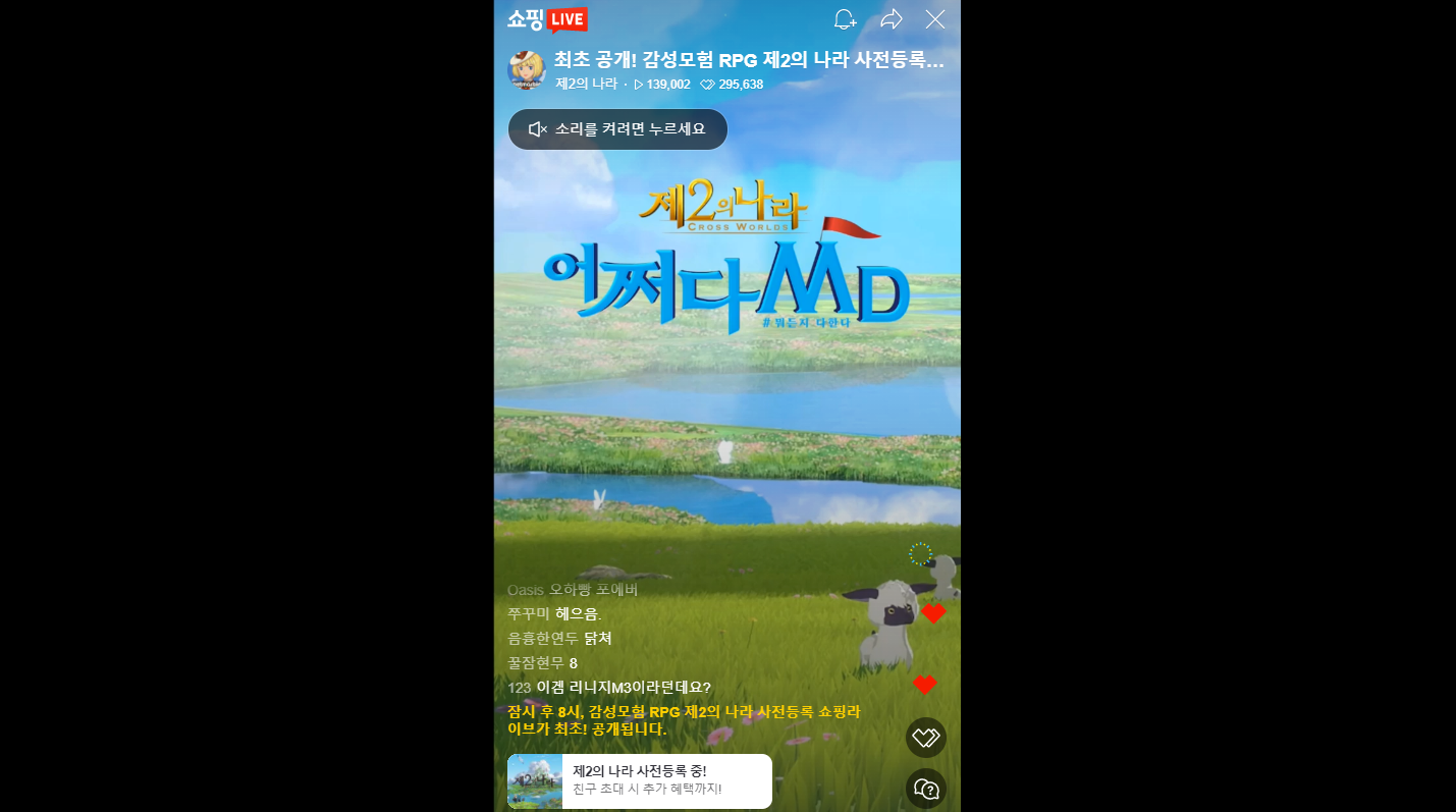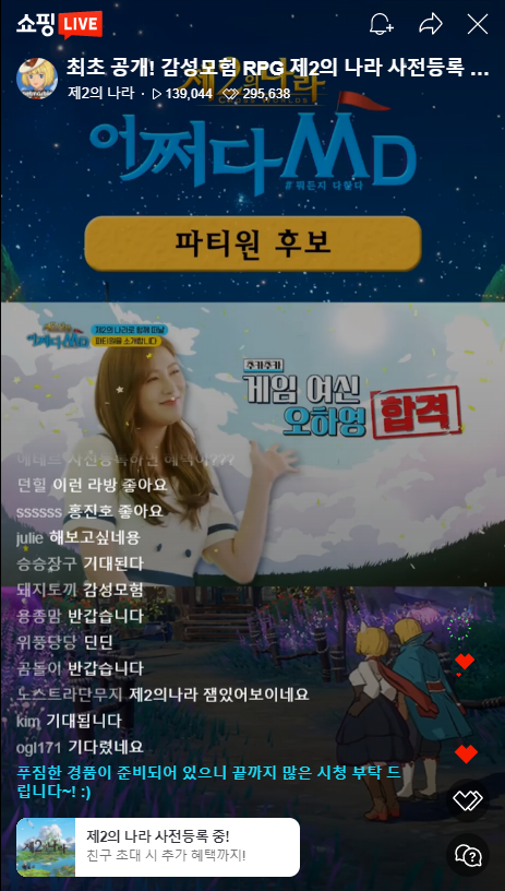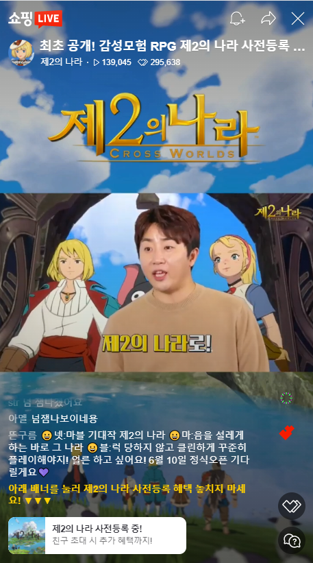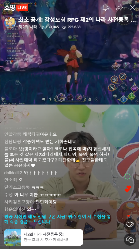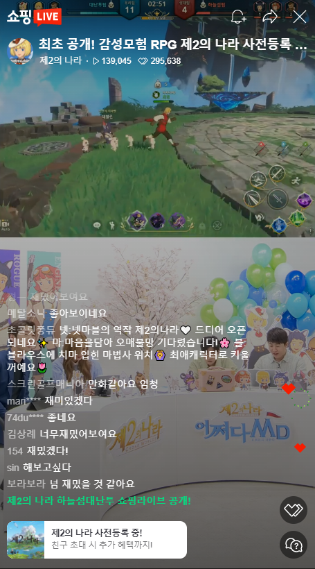 제2의나라 출시를 앞두고 다양한 이벤트와 행사도 진행되었습니다. 무엇보다 눈길을 끈 이벤트는 홍진호와 딘딘이 출연해 진행한 라이브 커머스 방송인데요, 초기 목표였던 22,222명을 훨씬 웃도는 14만 3천 명이 시청했을 정도이니 제2의나라에 대한 관심이 얼마나 뜨거운지 알 수 있었습니다. 벌써부터 대박 조짐이 보인다고 할까요?