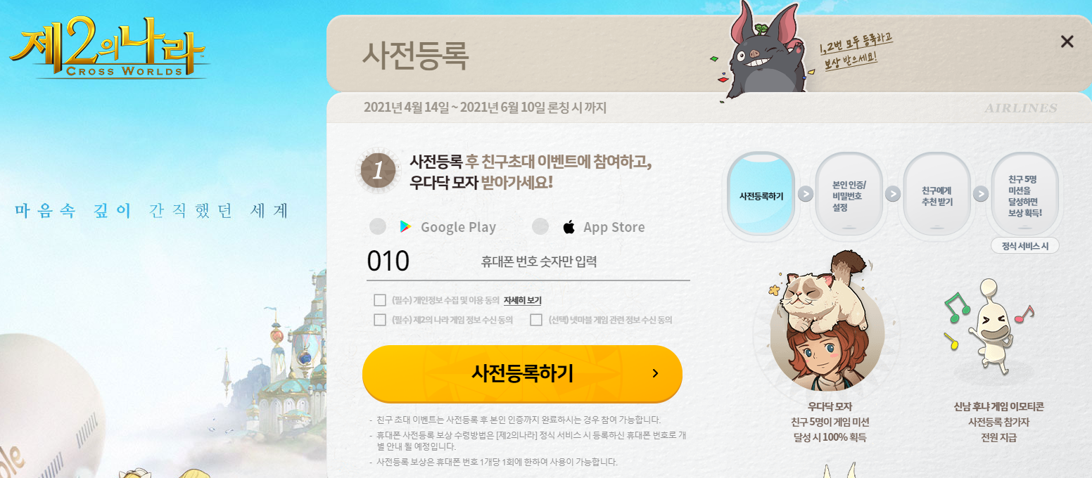 정식 출시 일정이 6월 10일로 확정된 만큼, 사전예약을 안한 분들이라면 서둘러야 합니다. 사전예약에 참여만 해도신남 후냐 게임 이모티콘과 HP소형포션 그리고 5만골드를 받을 수 있고, 친구 5명이 게임 미션을 달성하면 우다닥모자를 획득할 수 있는데요, 스토어에서도 사전등록을 진행하면 이마젠 우왕을 받을 수 있습니다.