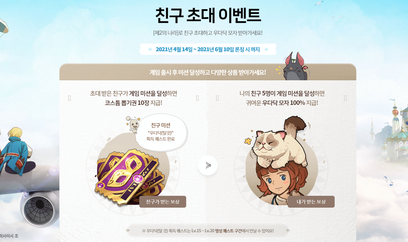 친구초대이벤트도 6월 10일 론칭 시까지 진행됩니다. 초대받은 친구가 게임 미션을 달성하면 코스튬 뽑기권 10장을 지급하고, 나의 친구 5명이 게임 미션을 달성하면 초대한 친구에게 귀여운 우다닥모자를 100% 지급합니다. 아직 늦지 않은 만큼 우다닥 모자가 갖고 싶다면 서둘러 친구들 초대하고 론칭과 함께 플레이를 시작하면 좋을 것 같습니다.