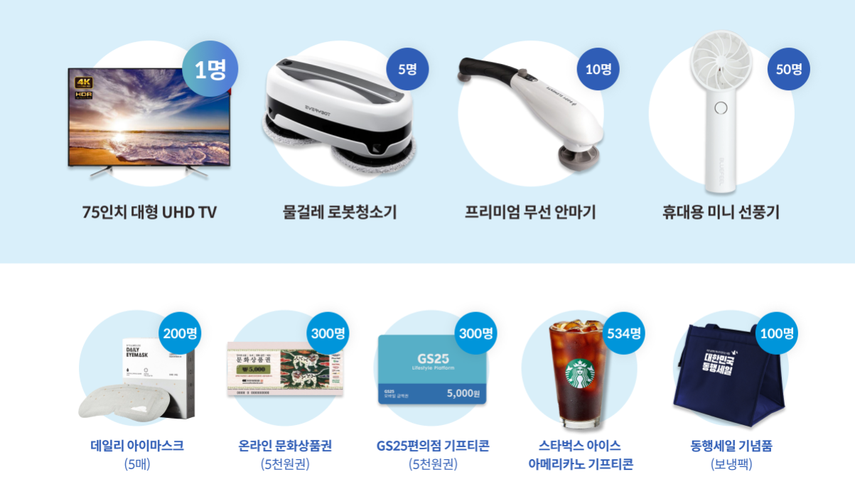 득템보탬 이벤트에 참여한 분들 중 추첨을 통해 75인치 대형 UHD TV부터 물걸레 로봇청소기, 프리미엄 무선 안마기, 휴대용 미니 선풍기등 엄청난 인원에게 선물이 주어지져 놓치기 아쉬울 정도입니다.
