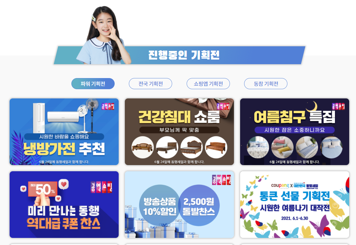 6월 24일 시작되는 2021 대한민국동행세일은 다양한 기획전과 라이브커머스, 그리고 이벤트등으로 구성되어 필요한 물건을 구입하기에 딱 좋은 시기이기도 합니다. 먼저 시작당일 공영쇼핑과 함께하는 냉방가전부터 건강침대, 여름침구등의 기획전이 준비되어 있는데요, 홈쇼핑에서 사용 가능한 쿠폰도 다양하게 주어져 역대급 할인을 받을 수 있습니다.
