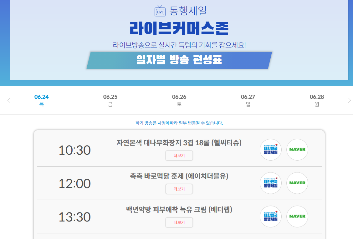 라이브방송으로 실시간 득템기회를 잡을 수 있는 동행세일 라이브커머스존도 구성되어 있습니다. 세일 당일 10시 30분 자연본색 대나무화장지3겹 18롤을 시작으로 각종 먹거리와 뷰티제품들이 준비되어 있는데요, 네이버외에도 쿠팡, 지마켓, 옥션, 티몬 라이브커머스를 통해 다양한 상품이 준비되어 있습니다.