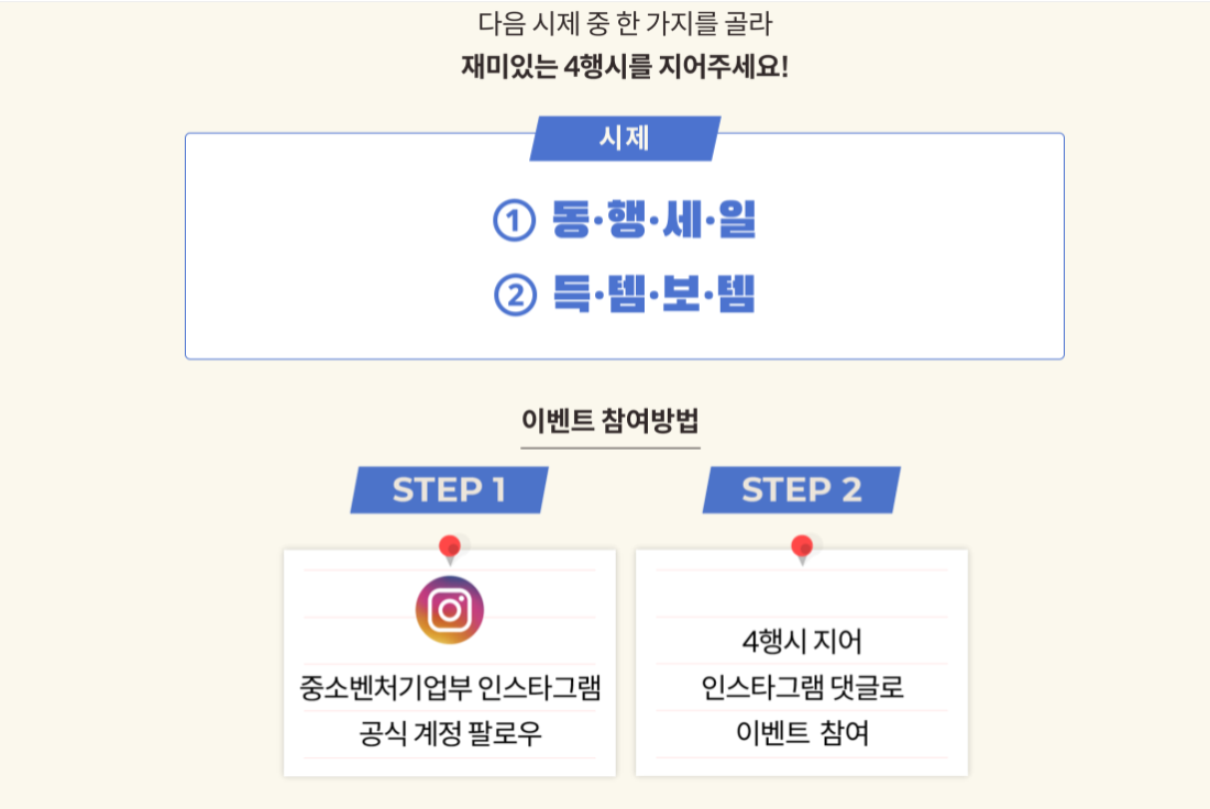 4행시 이벤트도 준비되어 있습니다. 동행세일, 득템보템 두 시제중 하나를 선택하여 진행하는 이벤트로, 중소벤처기업부 인스타그램 공식 계정을 팔로우 한 다음 4행시를 지어 인스타그램 댓글로 참여하는 방식입니다. 에어프라이어부터 자세교정의자, 플라워 디퓨저등 다양한 선물이 준비되어 있는데요, 나만의 센스 있는 사행시를 뽐내보는 것도 좋을 것 같습니다.