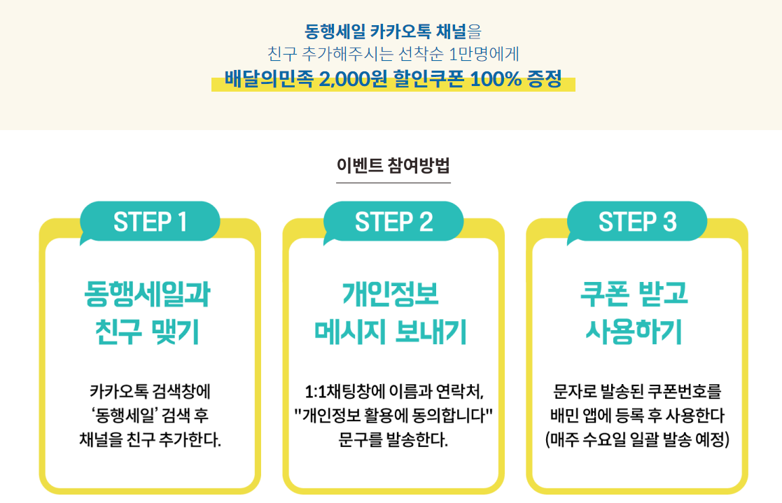 마지막으로 카톡채널 추가이벤트도 진행중입니다. 카카오톡 검색창에 동행세일을 검색후 채널을 친구추가한 뒤 1:1 채팅창으로 이름과 연락처 그리고 개인정보 활용에 동의합니다 문구를 발송합니다. 이후 문자를 통해 배달의 민족 2,000원 쿠폰이 발송되는데요, 선착순 1만명에게만 주어진다고 하니 서둘러 참여할 필요가 있을 것 같습니다.