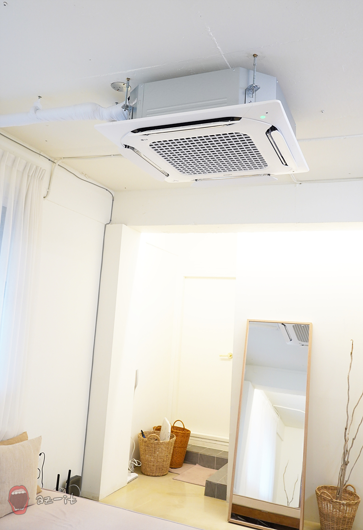 명동에 위치한 에어비엔비에 설치된 LG 휘센 인공지능 3.0 듀얼베인 시스템에어컨은 천정형 제품으로 효율적인 공간 활용과 코지한 인테리어와 잘 어울려 이질감 없는 공간을 연출하고 있어 편안한 느낌이 들었습니다.