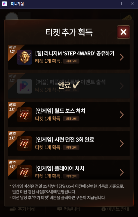 현재 진행 중인 4주년 사전 이벤트 미니게임은 25장의 카드를 뒤집고 인게임 아이템 보상을 받는 방식으로, 매일 주어지는 티켓과 혈맹 레이드, 월드보스 처치, 시련던전 완료등 주어진 추가 미션을 클리어 하고 티켓을 추가로 받아 카드를 디뒤집을 수 있습니다. 무엇보다 퍼플을 이용하면 추가 티켓까지 획득해 카드 보상을 챙기는데 더욱 유리합니다.