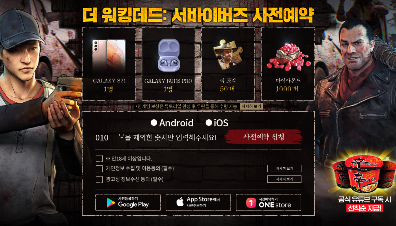이경영과 머니게임의 영상으로 기대감을 더욱 높여준 더 워킹데드: 서바이버즈의 사전예약이 현재 진행 중입니다. 사전예약에 참여한 인원 중 추첨을 통해 갤럭시S21과 갤럭시버즈, 릭조각, 다이아몬드 선물을 증정한다고 합니다. 여기에 공식 유튜브 구독시 신라면 쿠폰도 받을 수 있습니다.