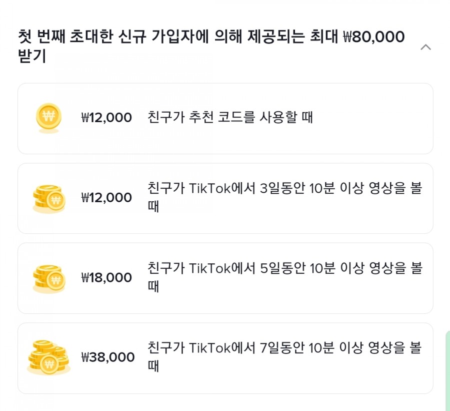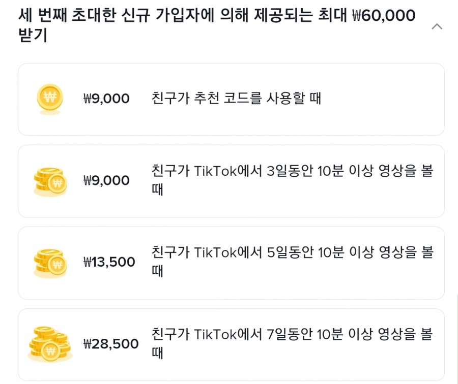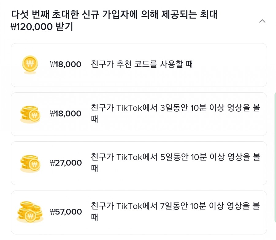 첫 번째 초대한 신규 가입자부터 다섯 번째 초대한 신규 가입자에게 제공되는 리워드 비용과 방식은 차이가 있습니다. 친구가 추천코드 사용시 받을 수 있는 비용부터 7일동안 틱톡을 활용하는 시간에 따라 추가 비용이 지급되기 때문입니다. .