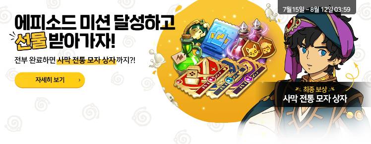 전설의 고대대 마인 에피소드 등장과 함께 시작된 에피소드 미션 달성 이벤트도 빼 놓을 수 없습니다. 주어진 미션을 달성하면 다양한 보상을 받을 수 있는데요, 최종 보상으로 전설의 고대마인 에피소드 분위기를 가득 담은 사막 전통 모자 상자(코스튬) 1개가 주어집니다.