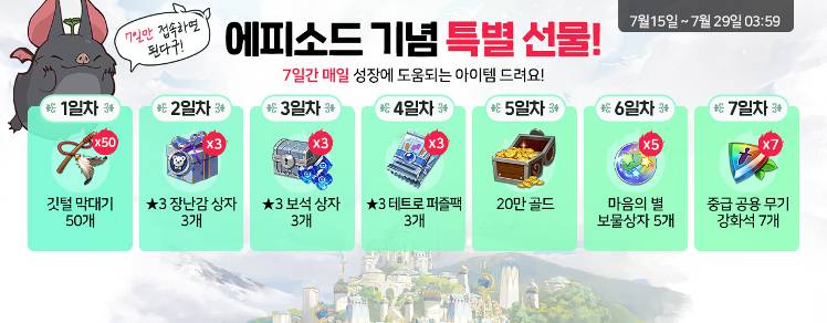 에피소드 기념 특별선물 이벤트도 진행 중입니다. 깃털 막대기 50개를 시작으로 3성 장난감 상자, 3성 보석상자등 접속만 하면 성장에 도움이 되는 아이템을 받을 수 있는데요, 신규 유저라면 속성별 이마젠에 아이템까지 정말 든든할 것 같습니다.