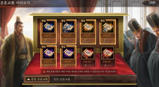 새로운 시스템인 공훈도 신설되었습니다. 기존 시즌2에서 전공 획득, 공성 참여, 토지 점령, 업적 임 부 완료 등의 기록들을 시즌 3 시작후 모두 공훈으로 환산되어 다양한 장비에 사용되는 특수 스킬 아이템과 장비 속성 제련 아이템, 그리고 개척 기간에 자원을 공금해줄 아이템을 구매할 수 있습니다.