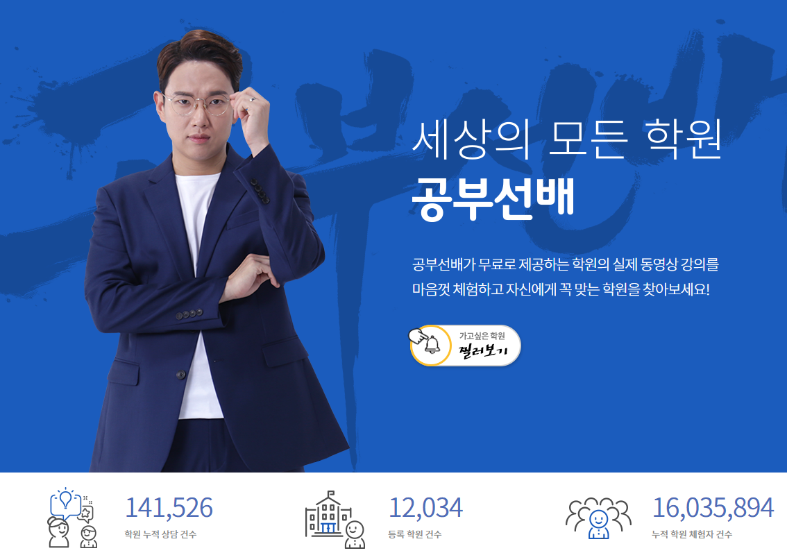 학생의 입장에서 학원선택은 정말 어려운 숙제인데요, 앞으로는 이런 고민 더이상 하지 않아도 될것 같습니다. 학원과 학원을 연결해주는 학원 O2O 플랫폼 공부선배가 있기 때문입니다. 학원 입장에서는 학생들을 유치해서 좋고, 학생 입장에서는 원하는 학원을 선택할 수 있으니 학원과 학생 모두에게 도움이 되는 플랫폼이라고 할 수 있습니다.
