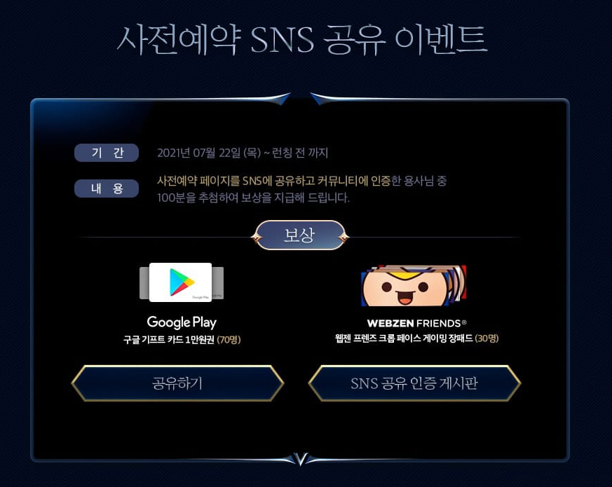 사전예약과 함께 사전예약 SNS 공유 이벤트와 공식 커뮤니티 가입 인증 이벤트도 함께 진행 중입니다. SNS 고융 이벤트의 경우 사전예약 페이지를 SNS로 공유하고 커뮤니티에 인증을 하면되고, 공식 커뮤니티 가입 인증 이벤트는 커뮤니티 가입 후 가입 인증 게시글을 작성하면 참여가 완료 됩니다. 참여한 인원 중에서 추첨을 통해 구글 기프트 카드와 웹젠 프렌즈 크롭 페이스 게이밍 장패드를 선물로 증정한다고 하니 놓치면 아쉬울것 같습니다.