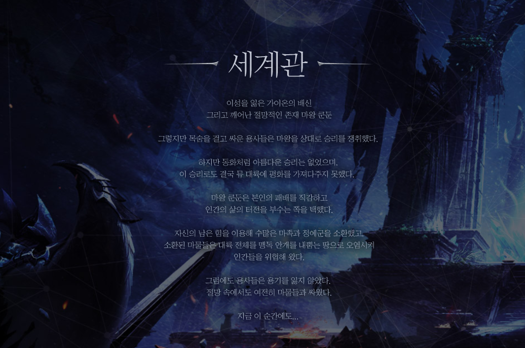 뮤IP를 바탕으로 한 만큼 스토리도 탄탄합니다.  간단하게 정리하면 이성을 잃은 가이온의 배신과 깨어난 절망적인 존재 마왕 쿤둔을 상대로 목숨을 걸고 싸웠고 싸우고 있는 용사들에 대한 이야기가 언급되어 있는데요, 뮤 대륙의 평화를 위한 용사들의 끊임없는 이야기를 세계관으로 가지고 있습니다.