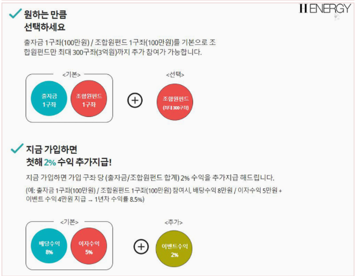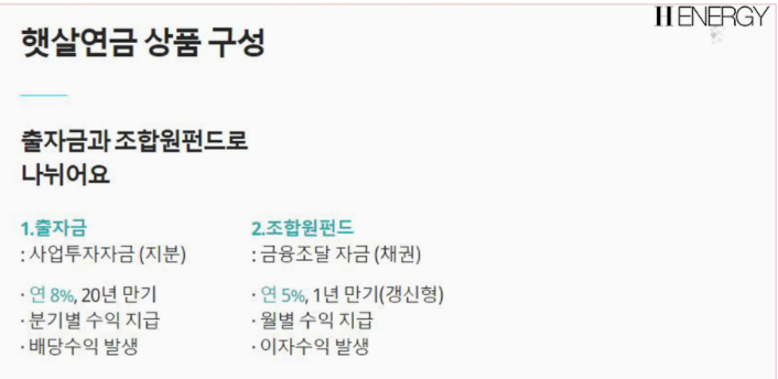 햇살연금에 참여하면, 분기별 또는 월별 수익을 꾸준하게 받을 수 있는데요, 출자금을 통한 분기별 수익을 선택할 경우 출자금의 8%에 해당하는 수익율을 올릴수 있습니다. 펀드를 활용한 월별 수익의 경우에도 연 5% 1년 만기 월별 수익을 받을 수 있어 시증 금리보다 2배 이상 높은 수익율을 가져갈 수 있는 점이 특징입니다.