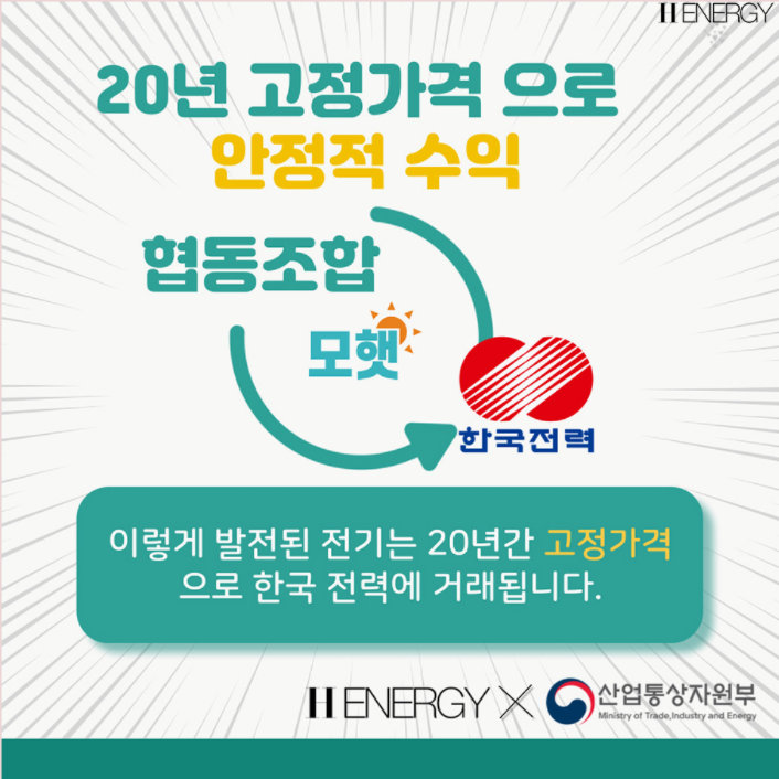모햇 햇살연금의 안전성은 운영 방식에 있어서도 차별화된 점이 특징인데요, 협동 조합 형태로 운영되기 때문에 지분에 따라 의결권을 가져가는 것이 아닌, 1인 1표로 함께 사업의 방향을 결정하는 것이 가능합니다. 또한 FIT 20년 장기고정가격계약 가능한 부분이기도 해 운영에 있어서도 신뢰할 수 있습니다.