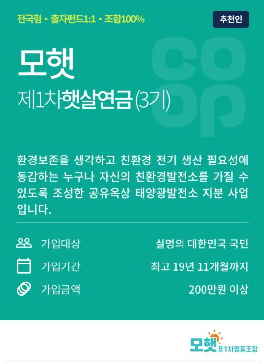 모햇 햇살연금은 시민이 참여하년 태양광 발전 사업으로 동조합 단위로 운영되기 때문에 한전과 20년 동안 장기고정가격을 맺처 안정적인 수익이 발생하는 점이 특징입니다. 때문에 안전한 투자를 선호하는 분들에게 적합한 사업이라고 할 수 있습니다.