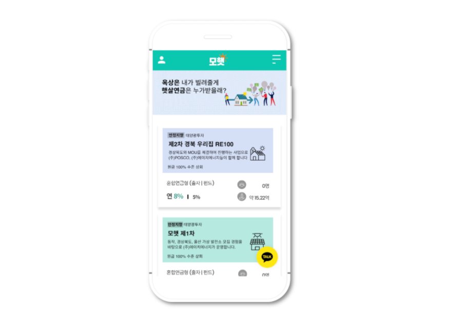 에이치 에너지 모햇은 누구나 자신의 에너지 자원을 소유하고 공유하며, 가치를 창출하는 서비스를 제공하는 기업으로 시민들이 참여하는 소형 태양광 사업을 위한 플랫폼 서비스입니다. 부지소유부터 까다로운 인허가 절차등 진입장벽이 높은 기존 태양광 시장과는 달리 비교적 적은 비용으로 태양광 발전에 참여 가능한 점이 가장 큰 장점입니다.