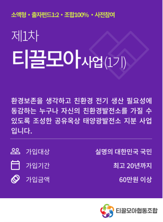 지역 제한 없이 참여 가능한 사업들도 준비되어 있는데요, 사업마다 참여 가능한 금액이 다르고, 가입대상과 가입기간이 달라 꼼꼼하게 확인하고 본인에게 맞는 사업을 선택할 수 있습니다. 현재 가장 소규모 비용으로 참여 가능한 사업은 티끌모아 사업으로 대한민국 국민 누구나 참여 가능하고, 1구좌 20만원 비용과 조합원 펀드 2구좌 비용인 60만원 비용으로 참여 가능해 큰 부담없이 시작할 수 있습니다.