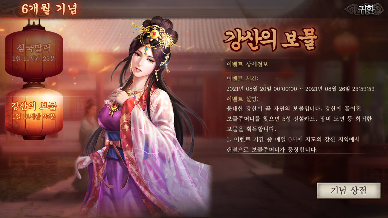 특히 8월 26일까지 진행되는 게임 반년 기념 축하 이벤트의 경우 첫날 이벤트 로그인시 바로 주성 스킨을 수령할 수 있고, 나머지 이벤트 기간 동안 랜덤으로 38~ 888 금화 보상도 챙길 수 있습니다. 또한 매일 게임에 로그인 하면 지도에서 보물주머니를 찾아 선물과 교환할 수 있으니, 잊지마시고 챙겨보시기 바랍니다.