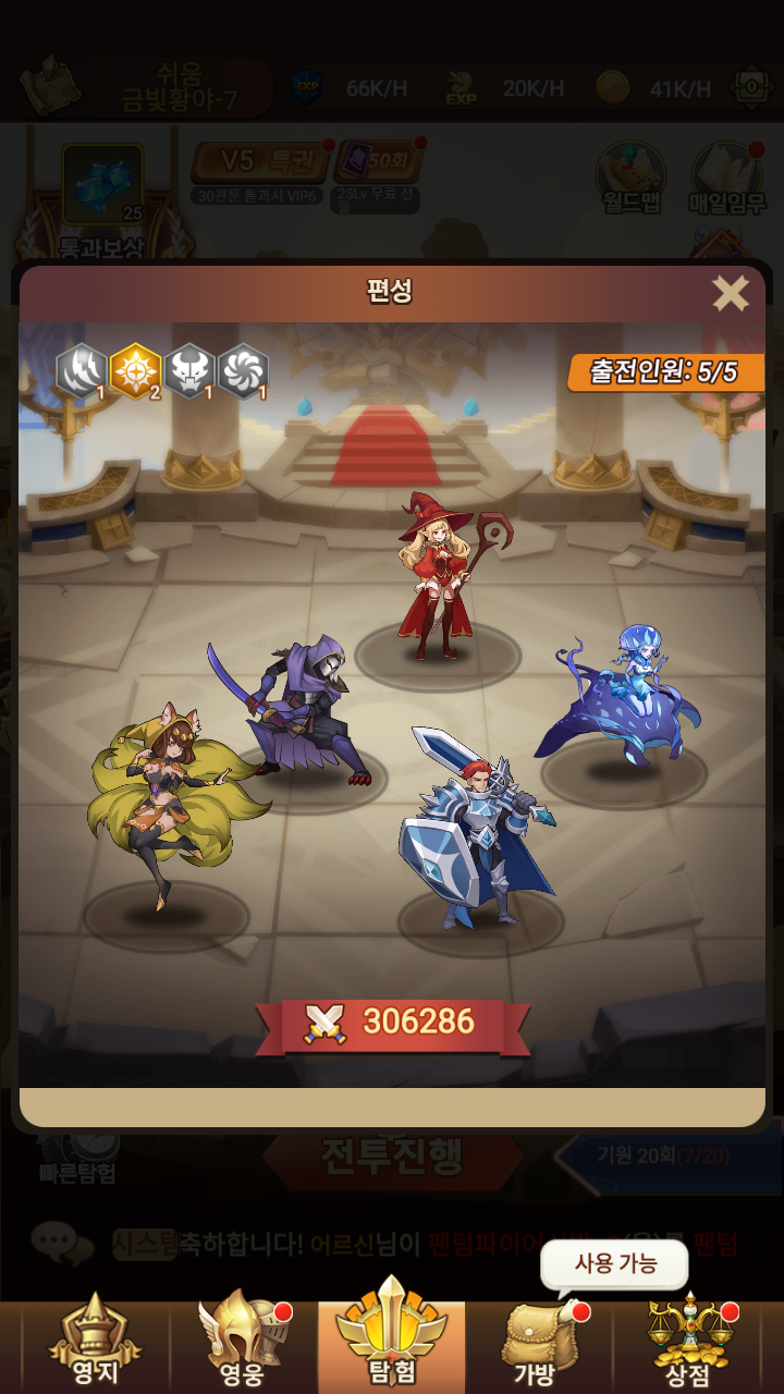 본격적인 탐험에 앞서 보유하고 있는 영웅을 팀으로 편성해야 하는데요, 최대 출전인원은 5명으로 초반 보유하고 있는 영웅 중 가장 등급이 높은 영웅을 우선으로 배치하면 쉽습니다. 무엇보다 시작과 동시에 무료 소환 50회가 가능해 이를 활용하면 초반 5성급 영웅 덱구성도 금방입니다.