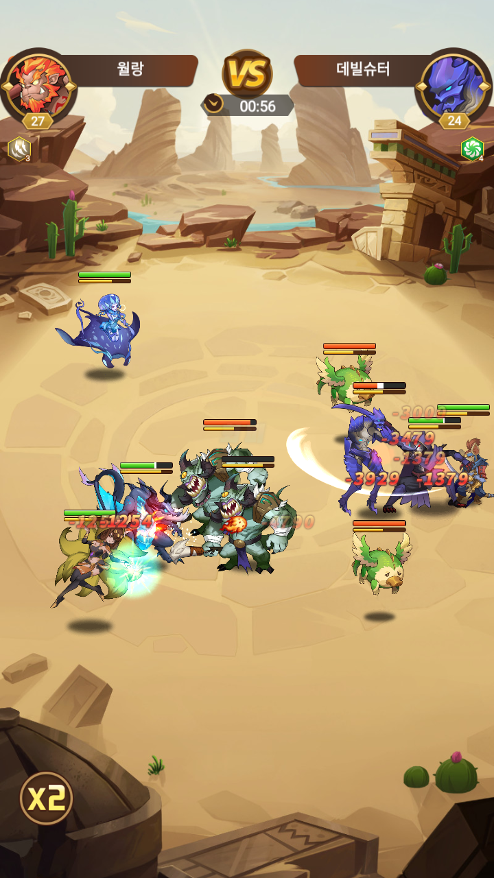 파티를 구성해 두면 별도의 조작 없이 전투가 진행 되기 때문에 아기자기한 캐릭터들의 전투를 구경만 하면 됩니다. 별도의 조작이 없기 때문에 편리한데요, 일정 스테이지를 넘어가면 최대 4배속까지 빠른 전투가 진행되어 지루할틈 없이 결과를 확인할 수 있습니다.