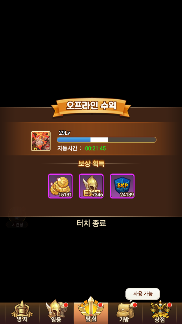 방치형게임 에픽아레나의 장점은 탐험 진행을 하지 않아도 골드와 영웅 경험치 그리고 유저 경험치를 획득해 빠른 성장이 가능하다는 점입니다. 탐험을 진행한 스테이지에 따라 오프라인 수익 또한 달라지게 되는만큼 탐험 스테이지를 꾸준히 밀어주고, 보다 많은 오프라인 수익을 받을 수록 성장 속도 또한 빨라지게 됩니다.