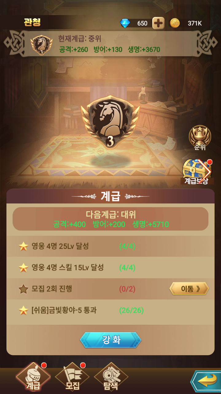 영웅 편성이 마무리 되었다면 본격적으로 탐험을 진행해야 합니다. 쉬움 난이도를 시작으로 일반, 어려움, 지옥단계로 진행되는 난이도는 각각의 관문으로 진행 되는데요, 관문마다 획득 가능한 보상이 다르고, 필요 전투력도 다르기 때문이 주어진 정보를 활용하여 도전하는 것이 중요합니다.