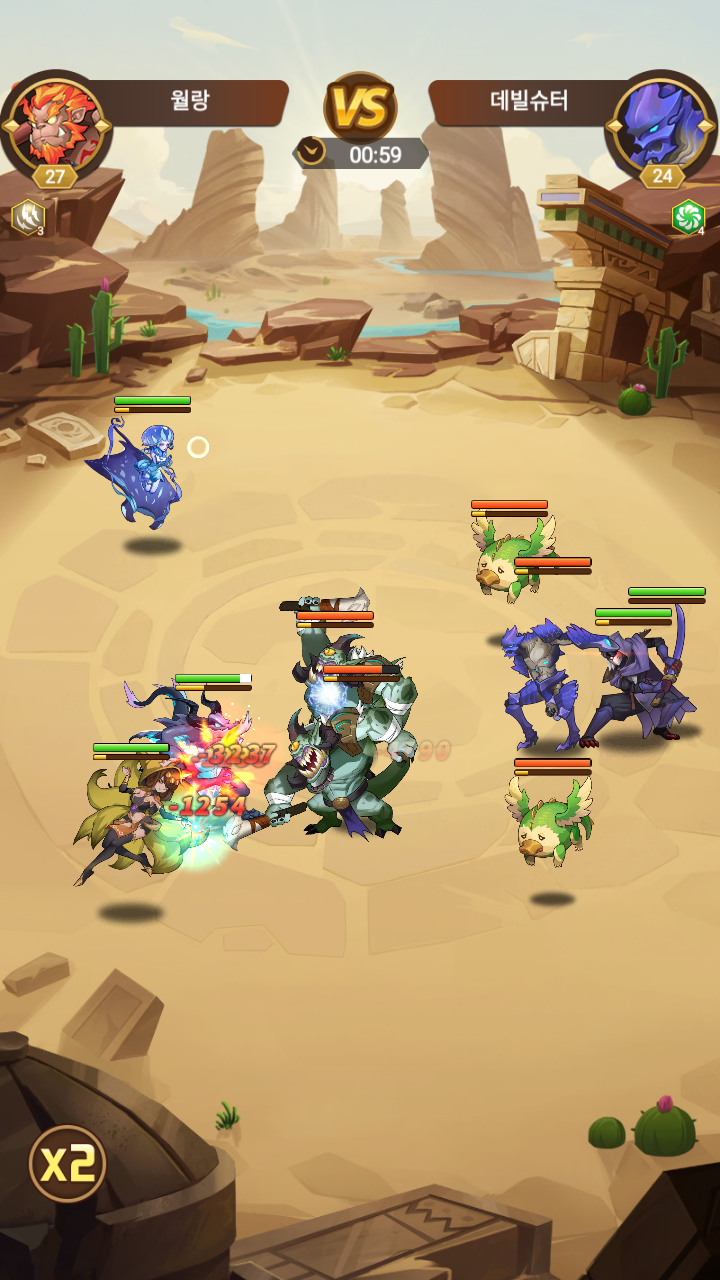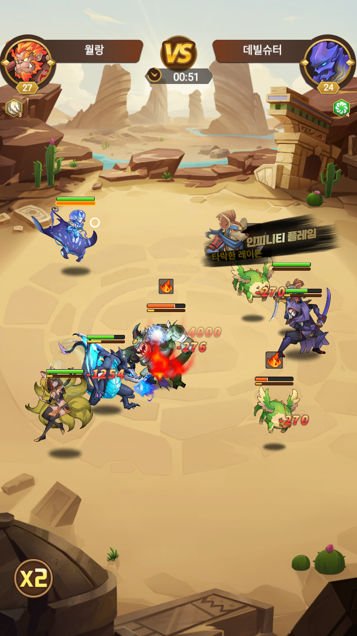 파티를 구성해 두면 별도의 조작 없이 전투가 진행 되기 때문에 아기자기한 캐릭터들의 전투를 구경만 하면 됩니다. 별도의 조작이 없기 때문에 편리한데요, 일정 스테이지를 넘어가면 최대 4배속까지 빠른 전투가 진행되어 지루할틈 없이 결과를 확인할 수 있습니다.