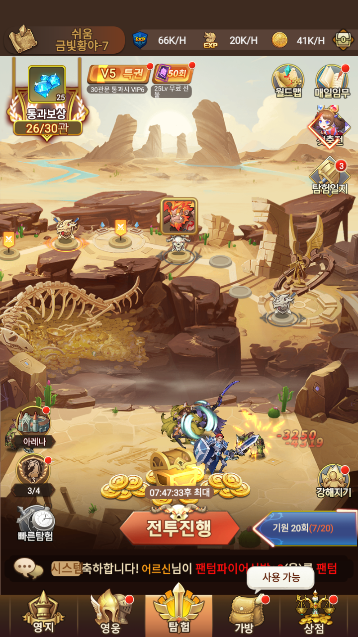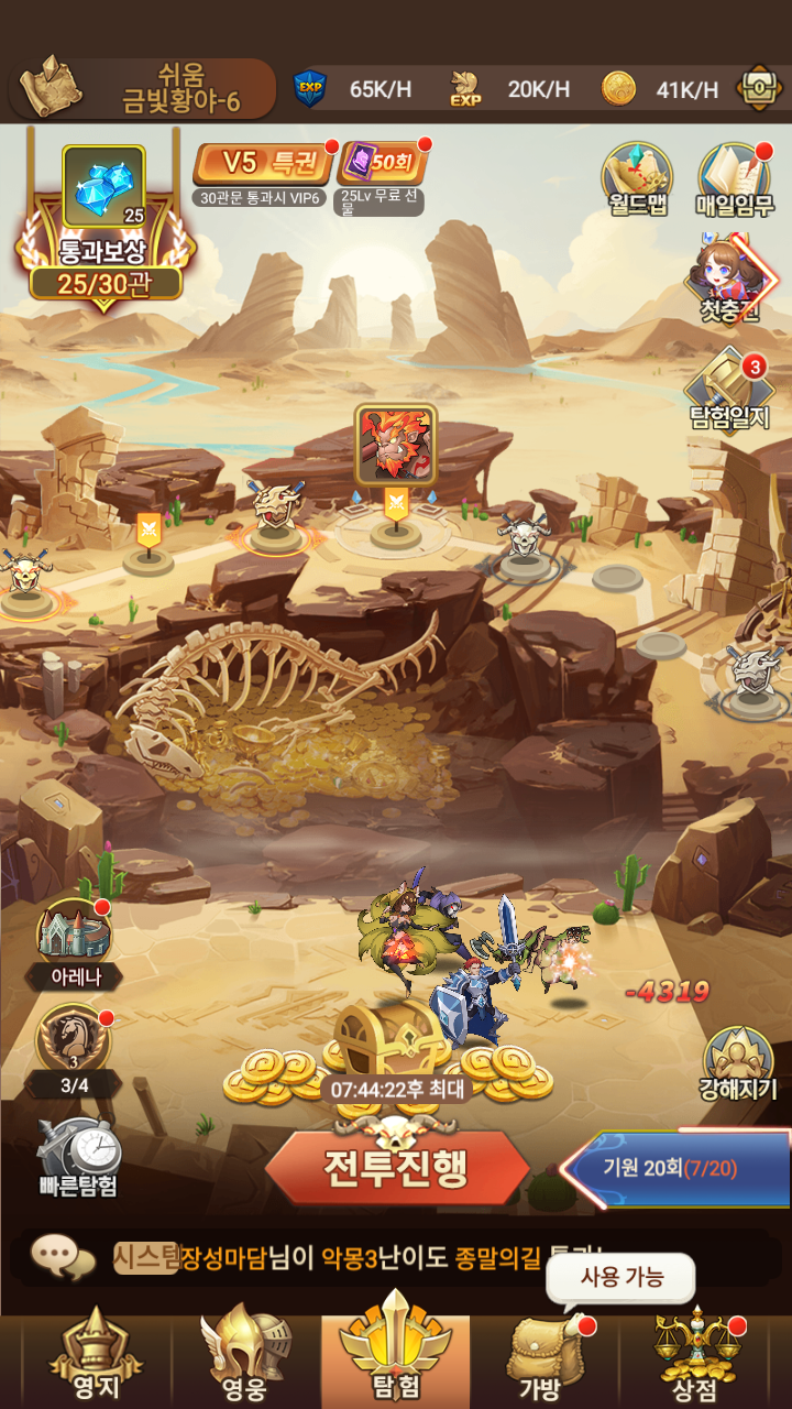 영웅 편성이 마무리 되었다면 본격적으로 탐험을 진행해야 합니다. 쉬움 난이도를 시작으로 일반, 어려움, 지옥단계로 진행되는 난이도는 각각의 관문으로 진행 되는데요, 관문마다 획득 가능한 보상이 다르고, 필요 전투력도 다르기 때문이 주어진 정보를 활용하여 도전하는 것이 중요합니다.