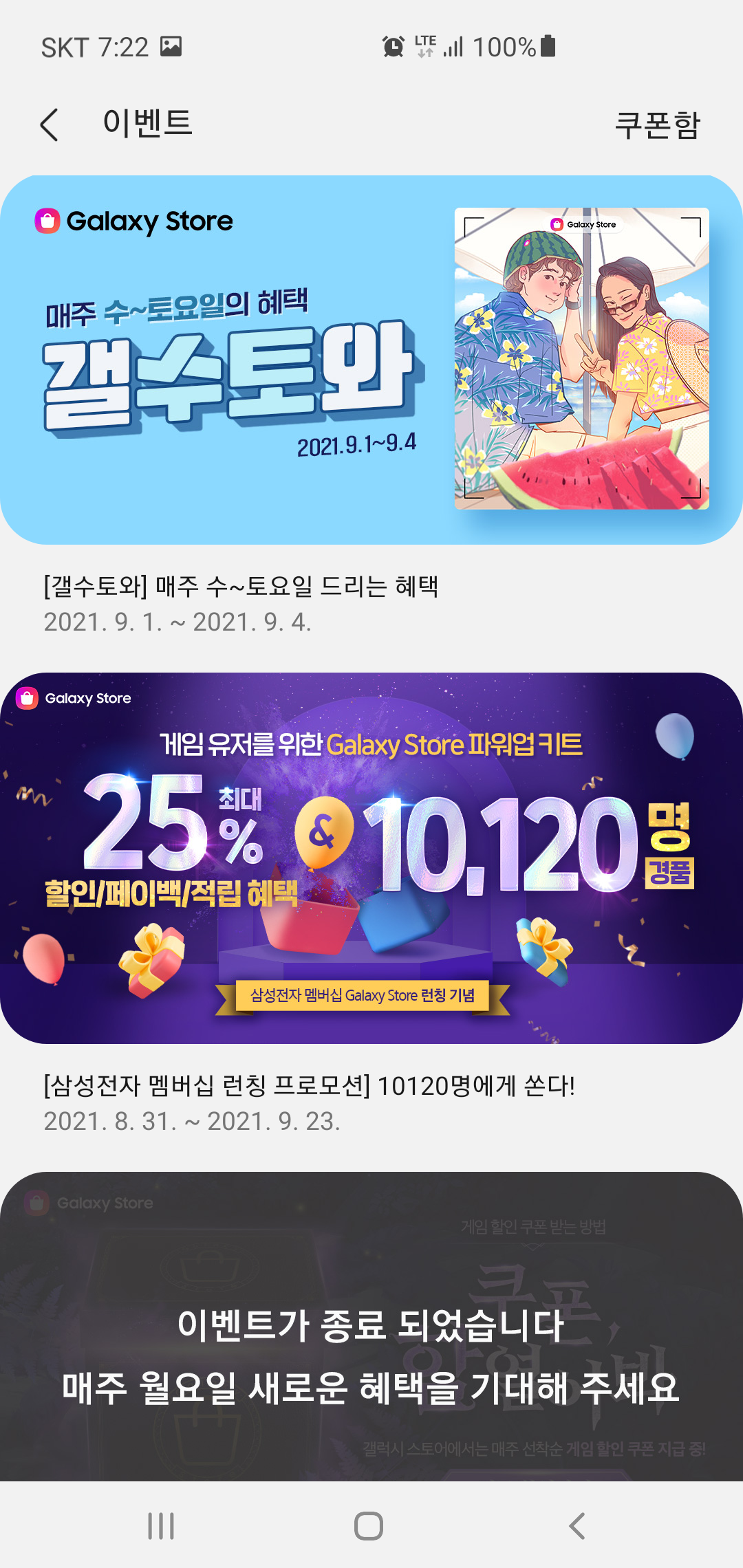 갤럭시 스토어에서 진행되는 이벤트는 삼성전자멤버십 외에도 다양한데요, 갤럭시 스토어 첫 결제 혜택 이벤트로 게임마다 최곤 150일 이내 구매 내역이 0회인 사용자를 위한 100원결제 이벤트와 삼성페이로 게임 아이템을 결제할 때 마다 게임 아이템 비용을 10% 할인 받을수 있는 십퍼 이벤트도 진행 중입니다. 진행중인 갤럭시 스토어 이벤트를 잘 활용하면 생각보다 큰 혜택을 받을 수 있는 만큼 꼭 챙겨보시기 바랍니다!