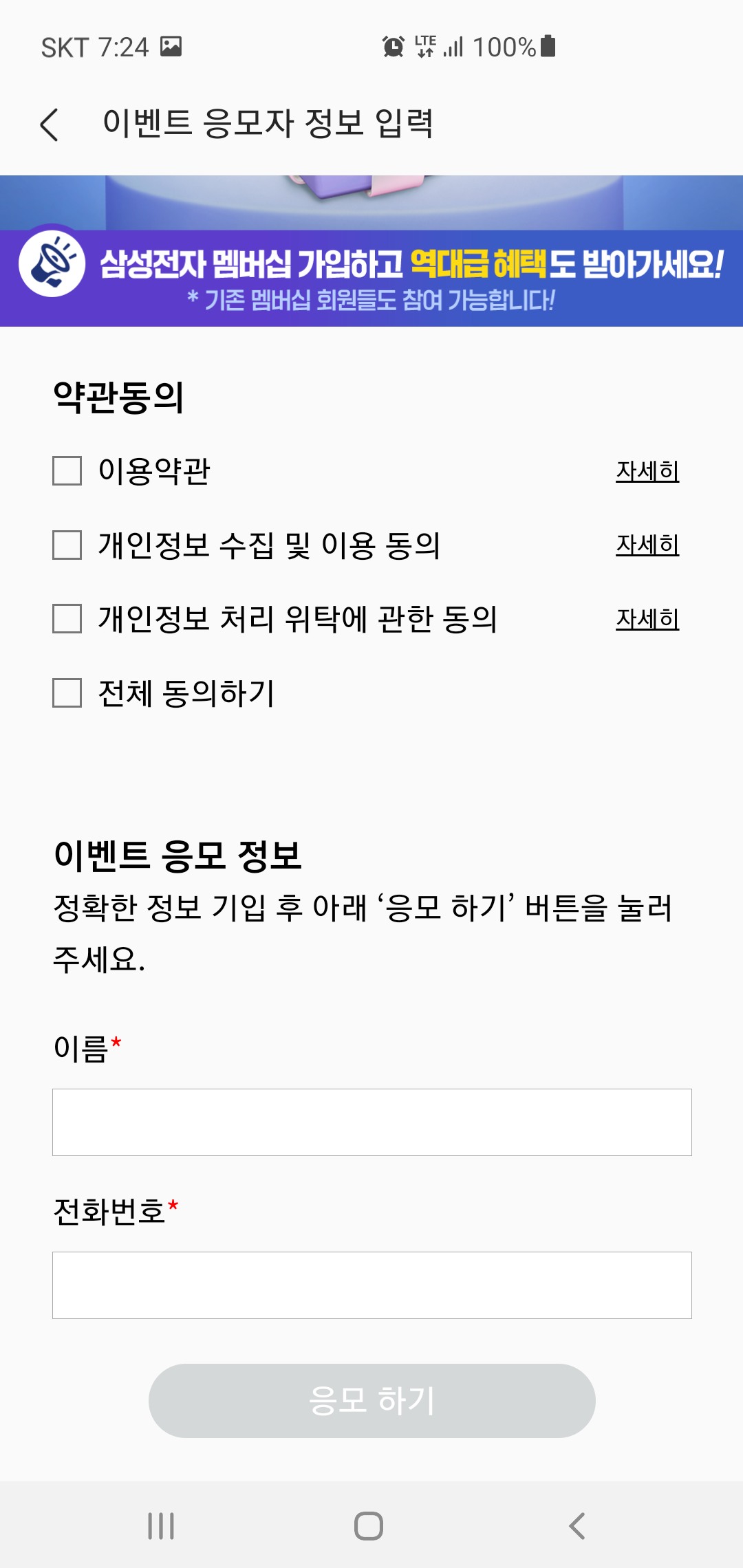 이벤트 페이지에서 내 멤버십 조회하기 버튼으로 포인트를 확인한 후 되돌아와 이벤트 응모하기 버튼을 누르면 이벤트 참여를 위한 약관동의와 이벤트 응모 정보를 기입할 수 있는 창을 확인할 수 있습니다. 이벤트 응모시 이름과 전화번호만 입력하면 별다른 기재사항 없이 응모가능합니다.