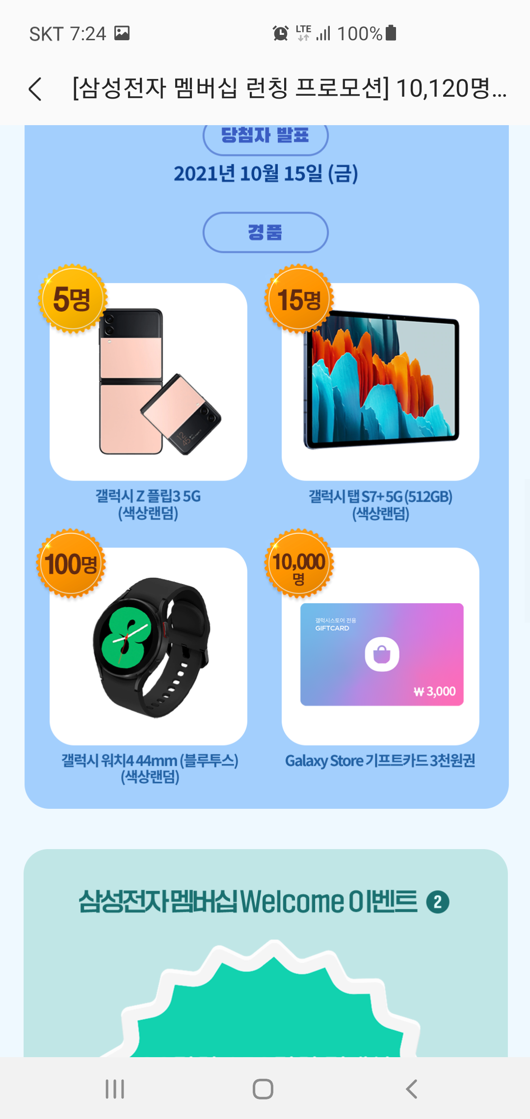 삼성전자 멤버십 웰컴이벤트를 통해 받을 수 있는 상품들을 보면 놓치기 아쉽다는 생각이 절로 듭니다. 갤럭시 Z플립3 5G 5명을 시작으로 갤럭시 탭 S7+5 15명, 갤럭시 워치4 100명 그리고 갤럭시스토어 기프트카드 3천원권이 10,000명에게 주어지는데요, 금액 상관없이 이벤트 기간 동안 게임아이템/테마/폰트 중 하나 이상 구매하면 참여 가능하니 이번 기회에 필요했던 아이템을 구매해보는 것도 좋을 것 같습니다.