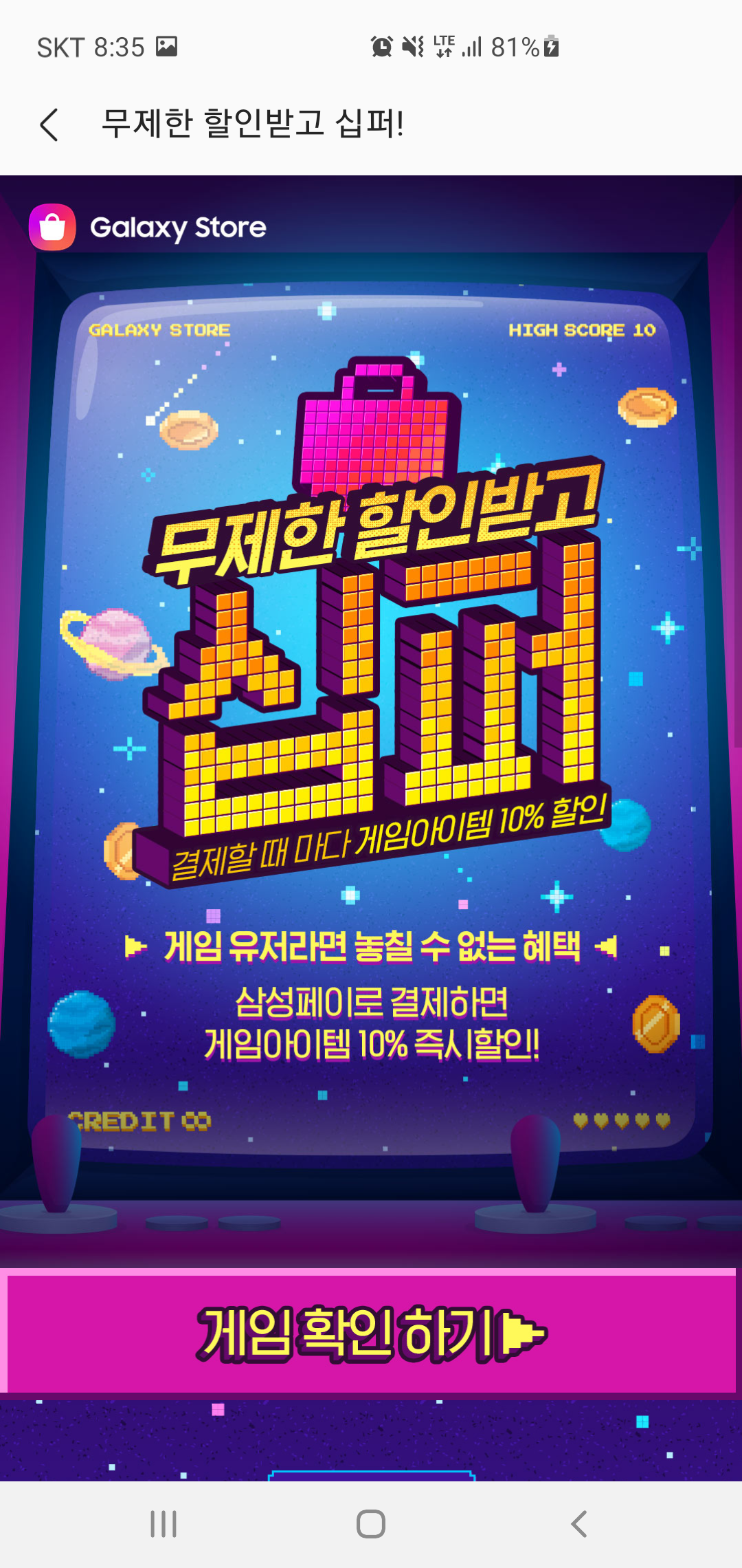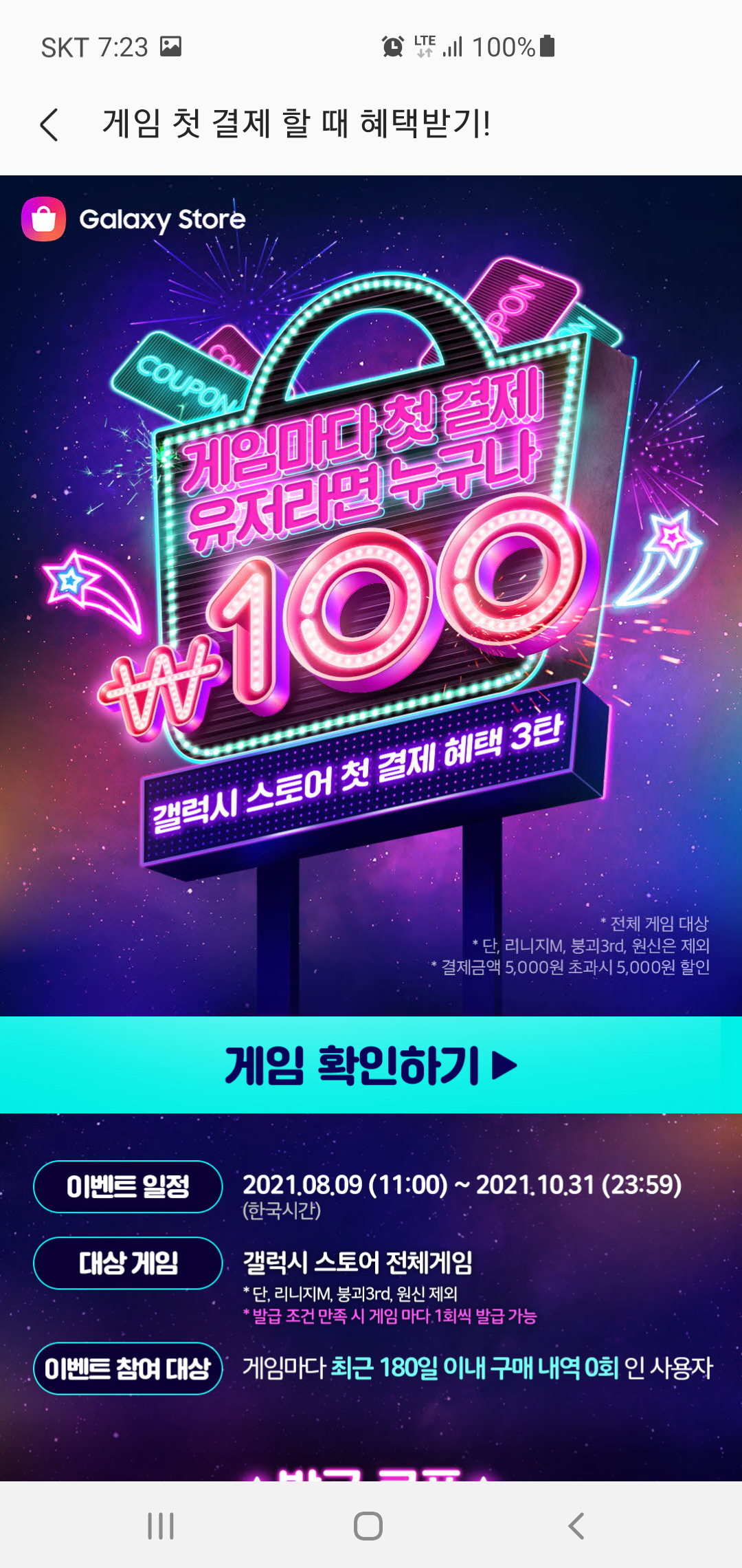 삼성전자 멤버십 특별 혜택 외에도 갤럭시 스토어에서 진행되는 삼성페이 상시 10% 할인 이벤트부터 매주 최대 1만원 할인을 받을 수 있는 쿠폰, 그리고 게임마다 첫결제 할은 100원, 25% 확률로 결제 금액의 100%를 페이백 받을 수 있는 혜택도 주어집니다.