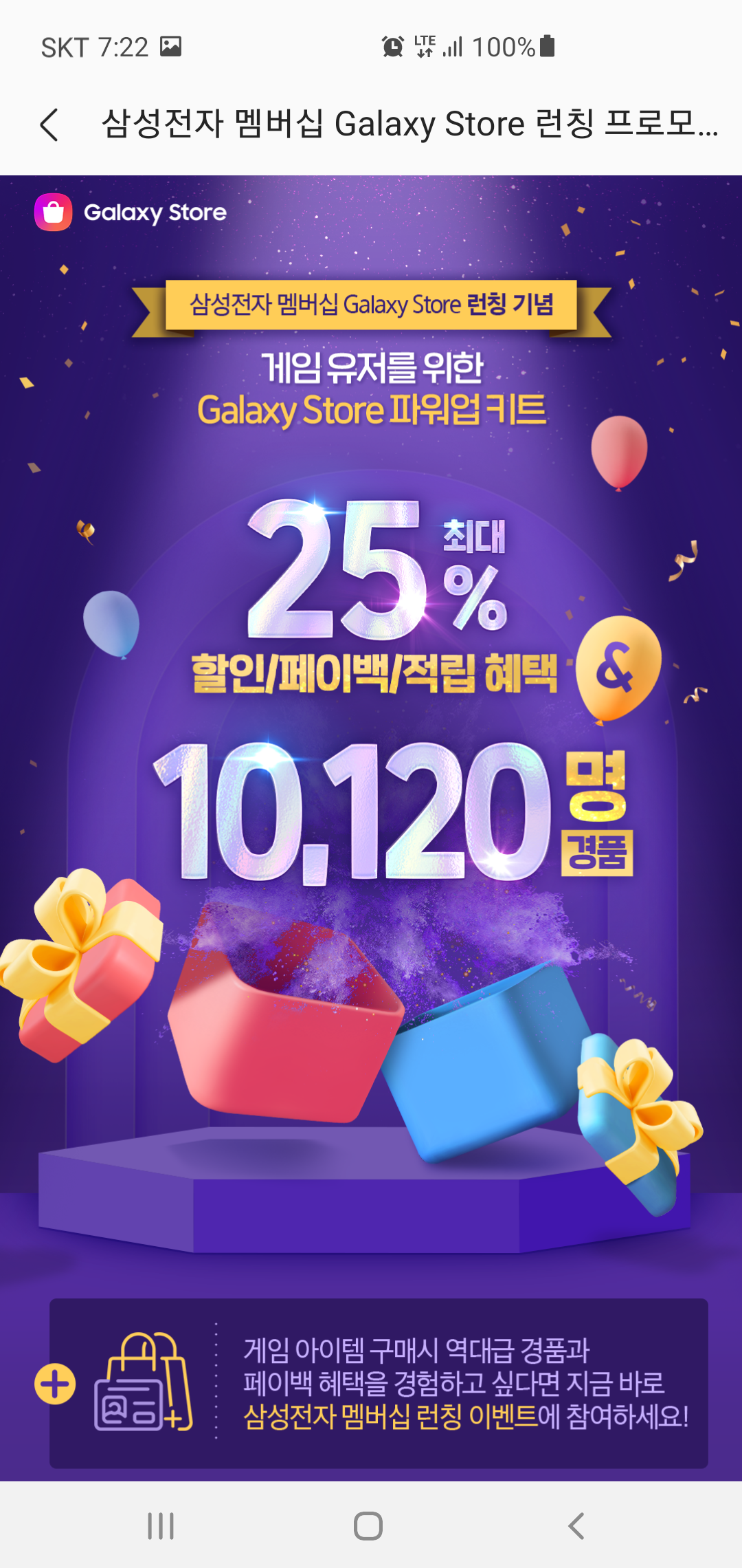 삼성전자 멤버십 갤럭시 스토어 런칭기념으로 진행되는 이번 이벤트는 혜택이 어마어마 한데요, 사용 비용의 25%에 해당하는 비용을 할인/페이백/적립혜택을 받을 수 있습니다. 그리고 여기에 추가로 10,120명에게 주어지는 경품까지 구성되어 있어 규모가 상당합니다.