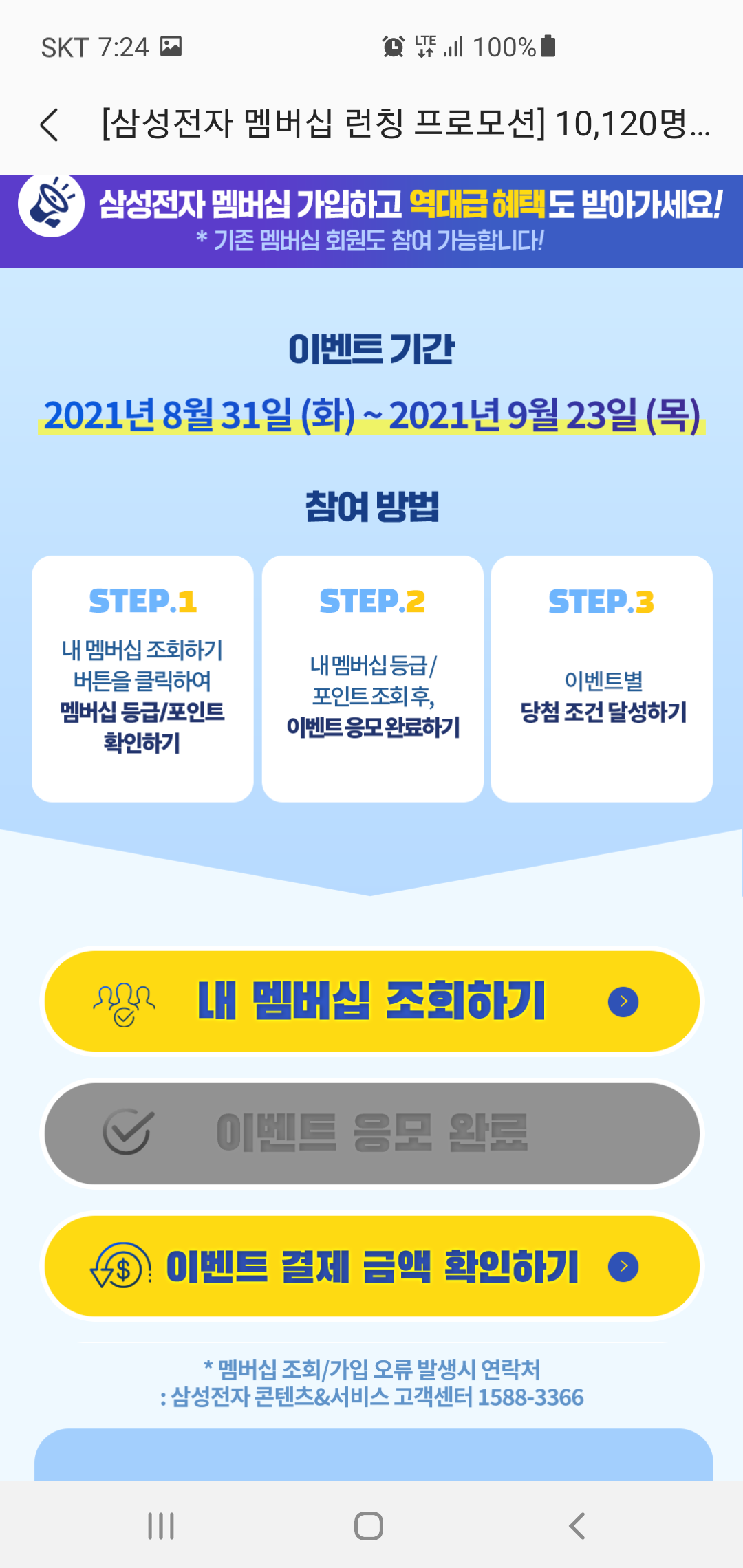갤럭시 스토어에서 진행되고 있는 삼성전자 멤버십 이벤트는 8월 31일 시작되어 오는 9월 23일까지 진행되는데요, 단순히 결제 혜택만 주어지는게 아니라 할인, 페이백 그리고 적립혜택 모두를 노려볼 수 있는 대박 이벤트라고 할 수 있습니다.