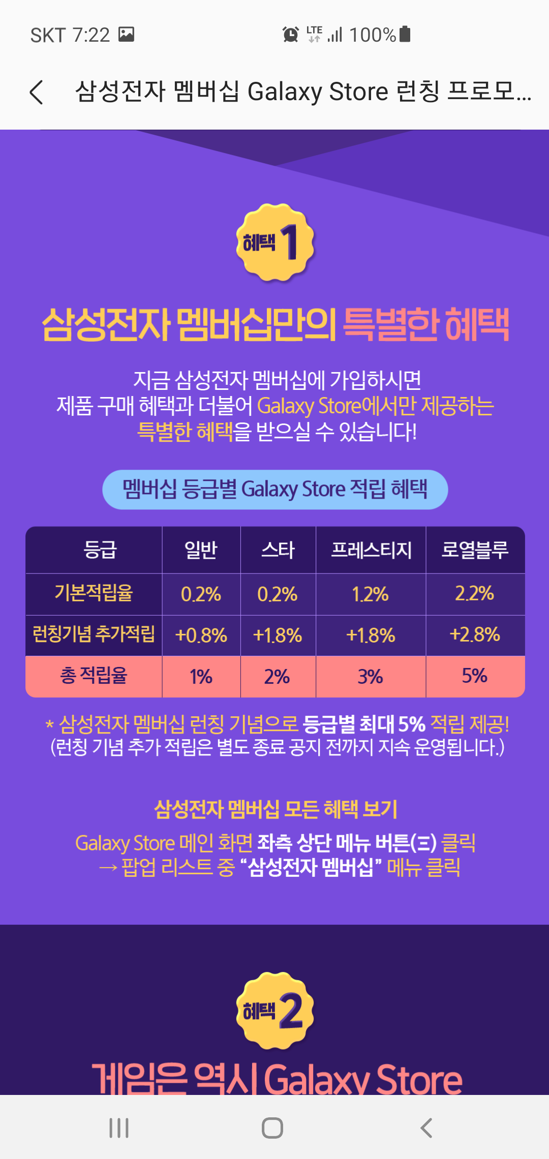 갤럭시 스토어에서 진행되는 삼성전자 멤버십 런칭 기념 이벤트의 첫번째 특별한 혜택은 삼성전자 멤버십에 가입하면 사용 비용에 따라 적립되는 기본 적립율에 런칭 기념 추가 적립립까지 진행된다는 점입니다. 로열 블로 등급 기준 기본 적립률 2.2%에 추가 2.8% 적립까지 더해져 총 5%의 적립율을 자랑합니다.